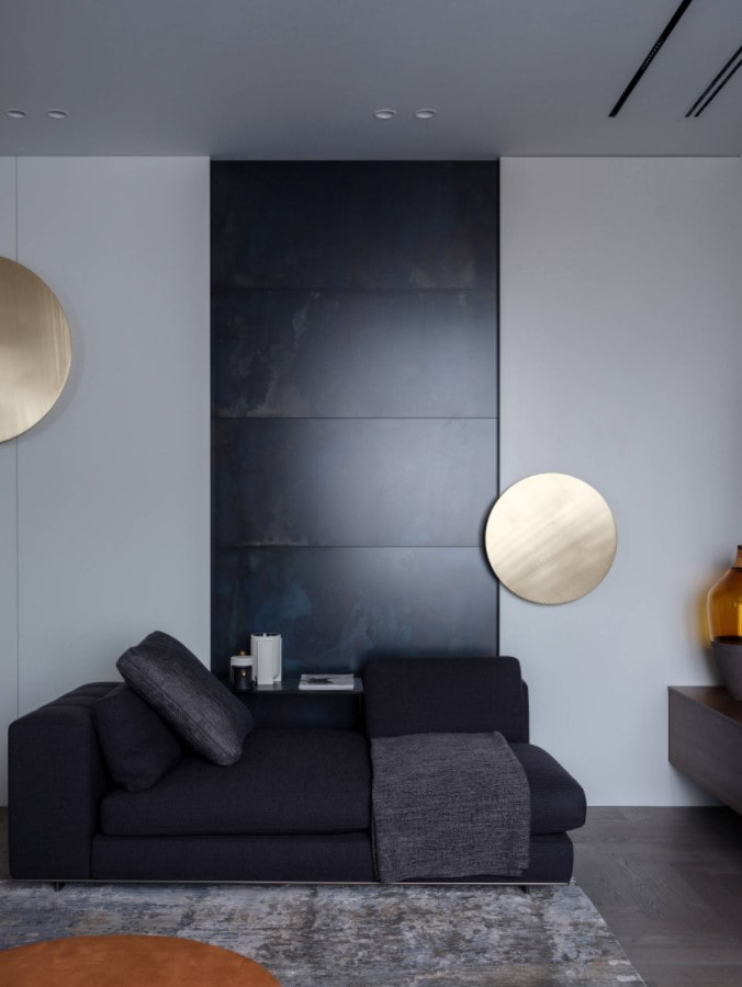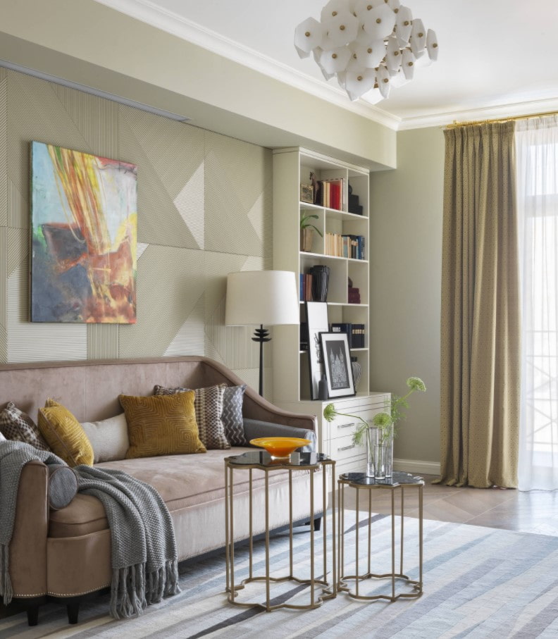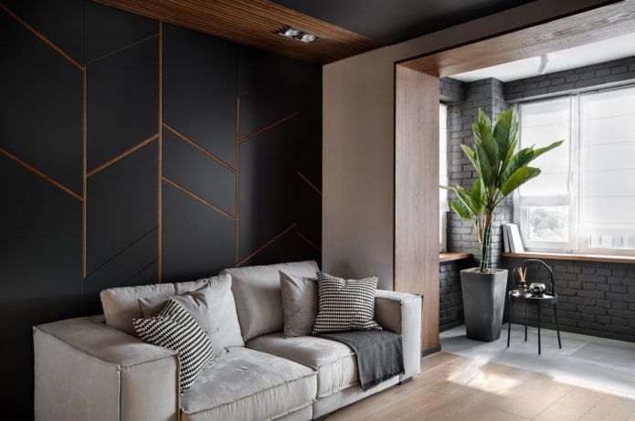 There are already two applications here, but most often with panels highlight the wall behind the sofa (all or part). Just like behind the bed, the panels protect the wall from mechanical damage and have a decorative function.