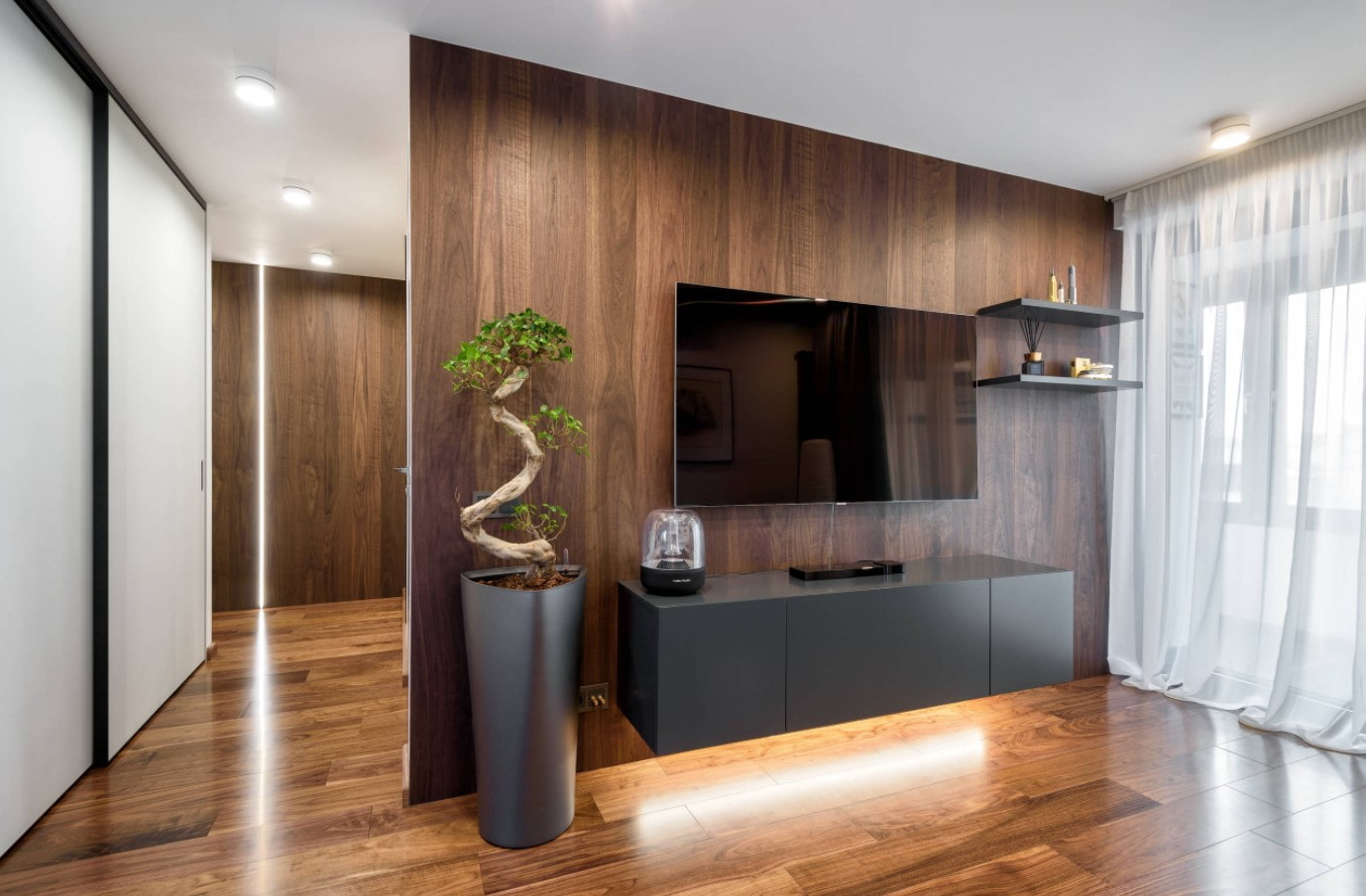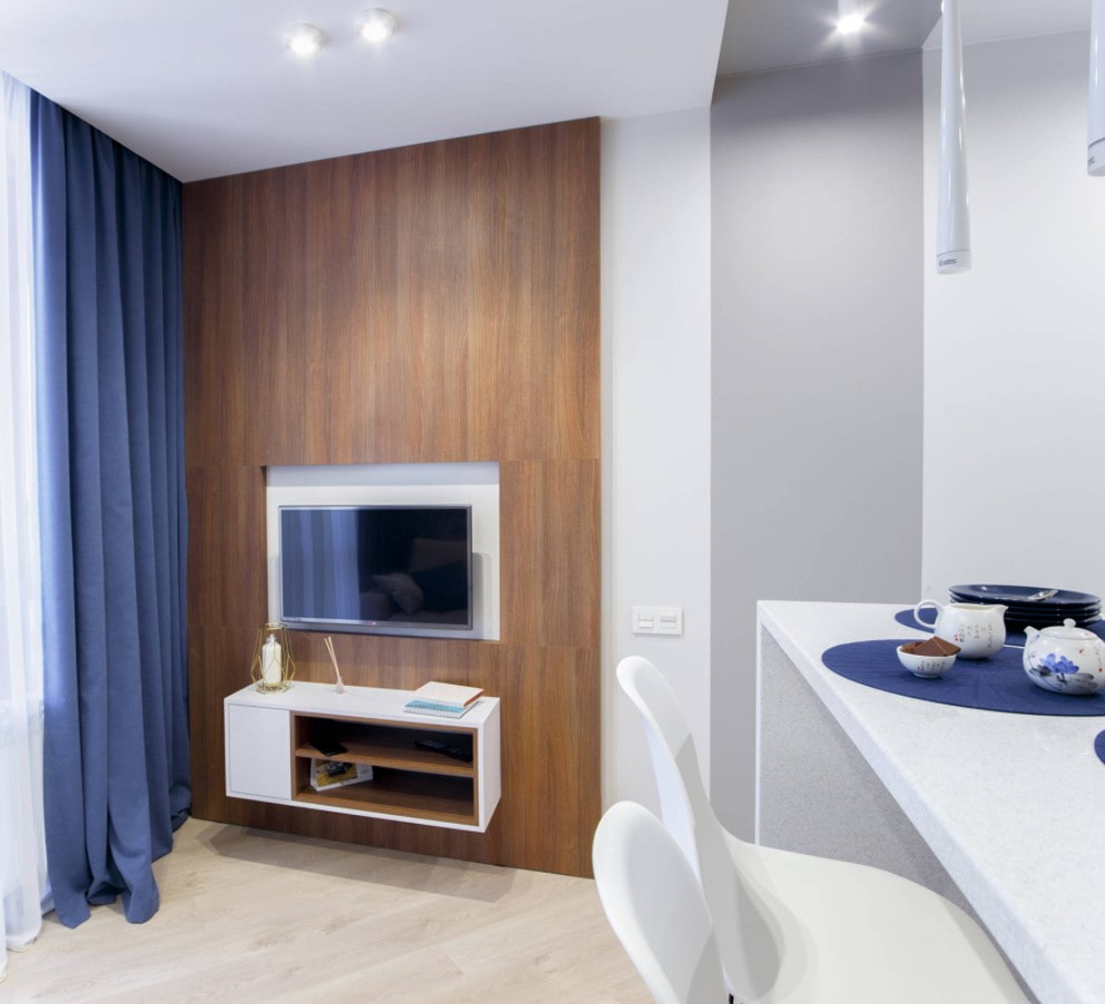The second, favorite by designers option is the allocation of a zone with a TV. In the box used for the installation of MDF sheets, wires are hiding well... The result is a stylish media zone.