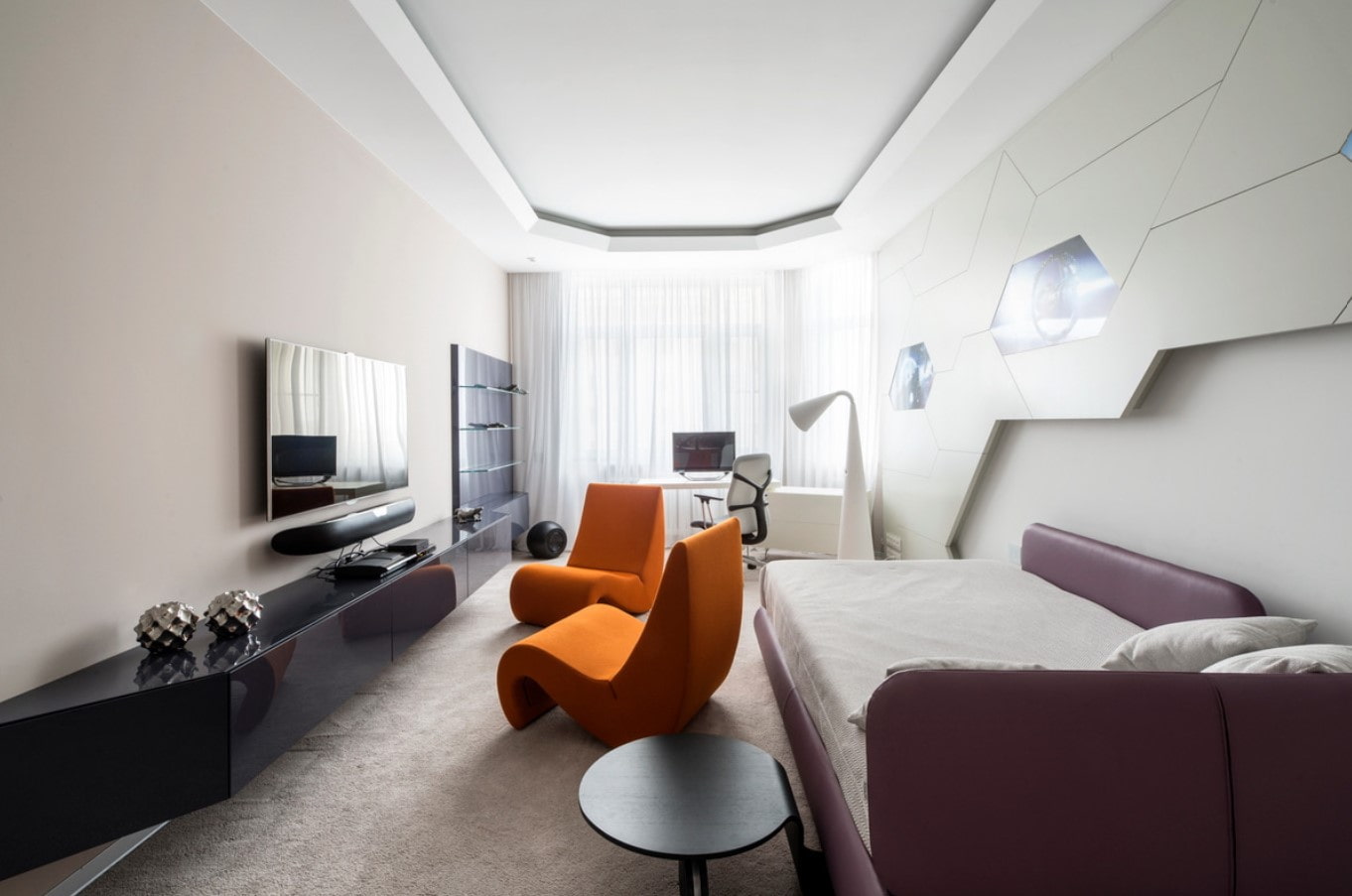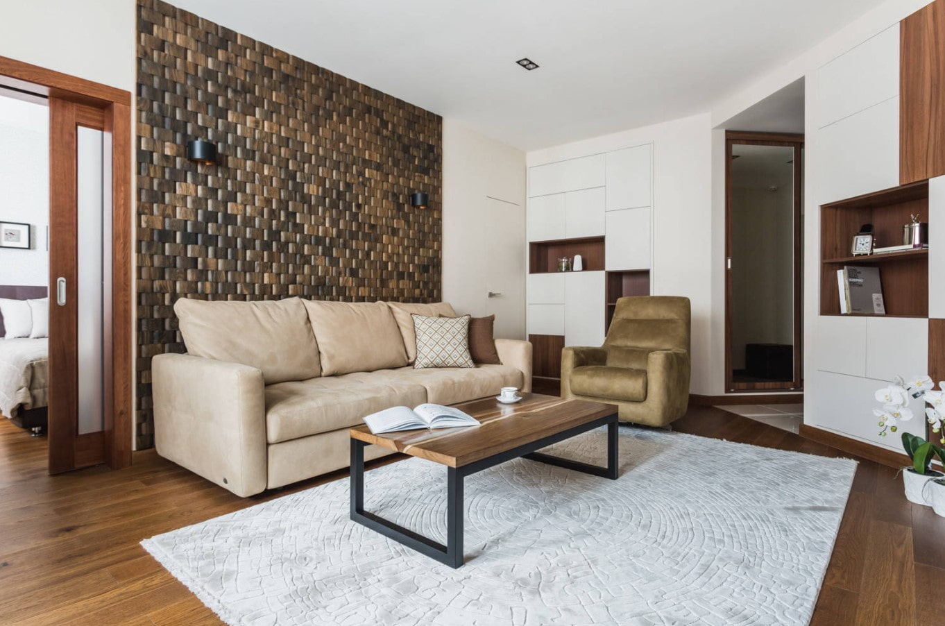 Wall covering. Rarely when MDF sheets are used as a material for the whole room, more often they highlight accents: for example, highlight the media area in the living room or dining in the kitchen, decorate the surface behind the bed in the bedroom, or use it to adjust the geometry of the room.
