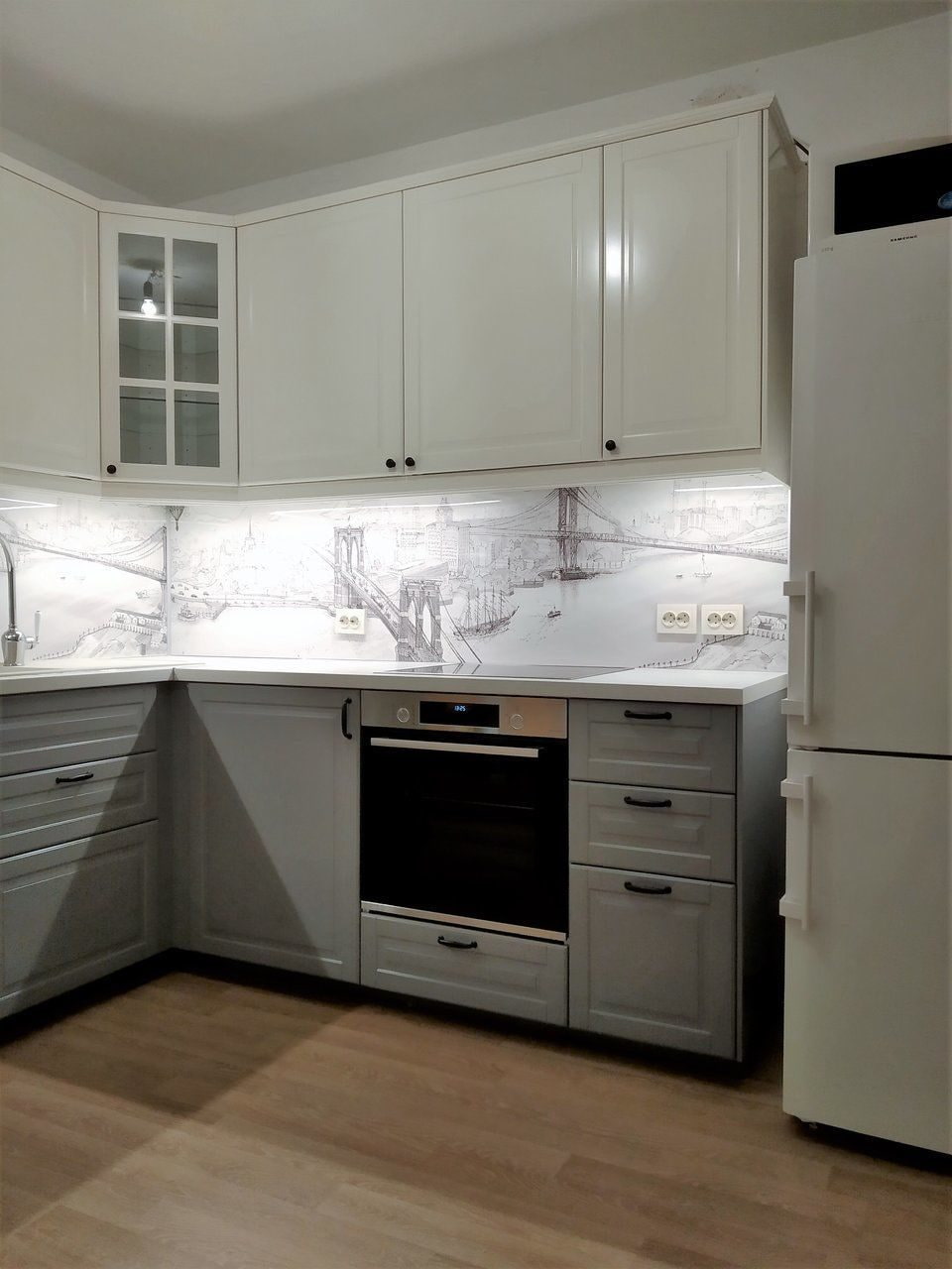 A functional use case is an apron, we have already talked about it in the previous sections. An apron made of MDF can be attached not only between tiers, but also on kitchen without upper cabinets - for this, the upper edge is closed with special decorative U-shaped plugs (they also protect the slab from moisture).