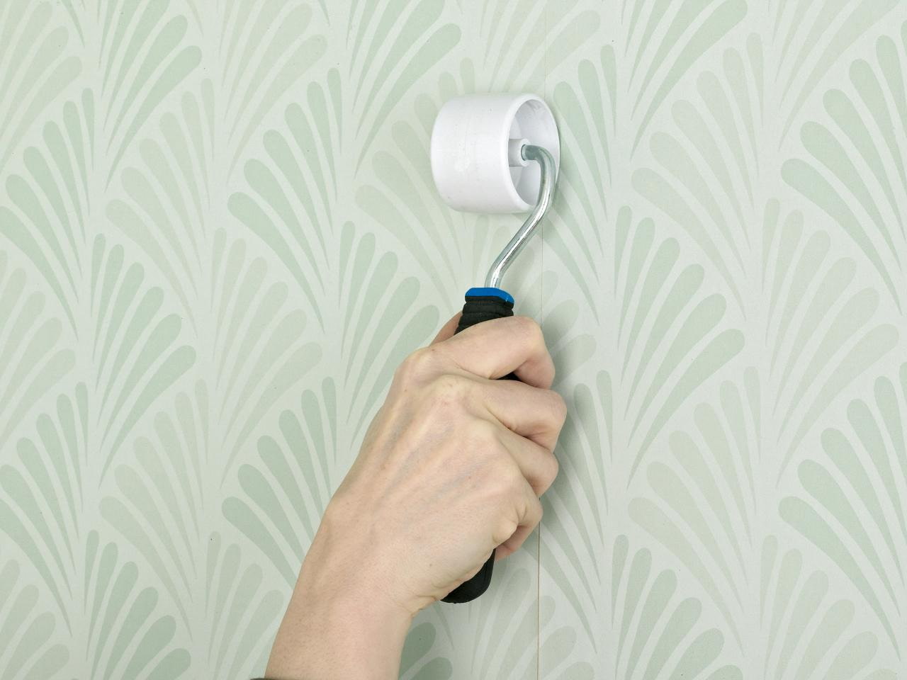 - Press carefully, level with a wallpaper spatula, removing creases, bubbles. If glue flows out, remove it with a rag.