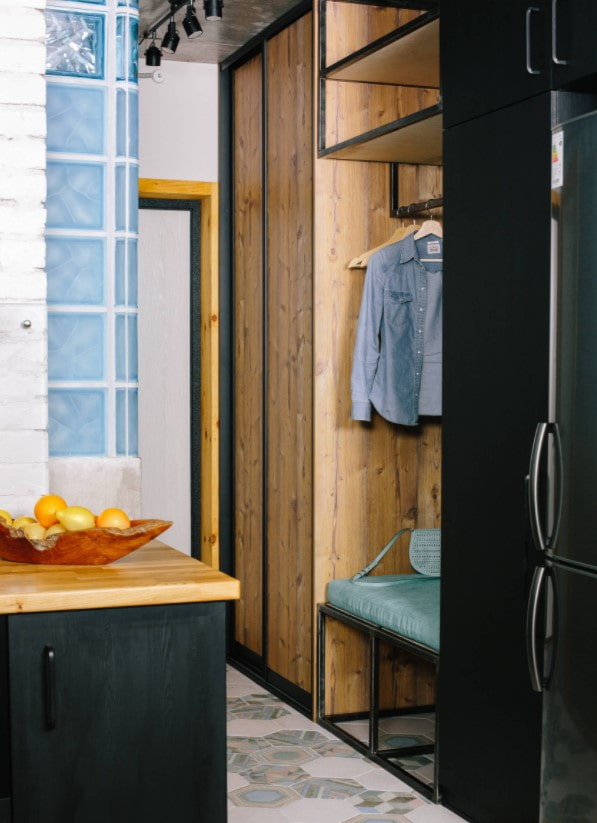 And the last thing - so that the overall design of the room looks harmonious, make it so that Entrance door echoed with other elements in the hallway. In the photo, for example, a metal frame is visible: the same metal is used for the console legs and handles cabinet.