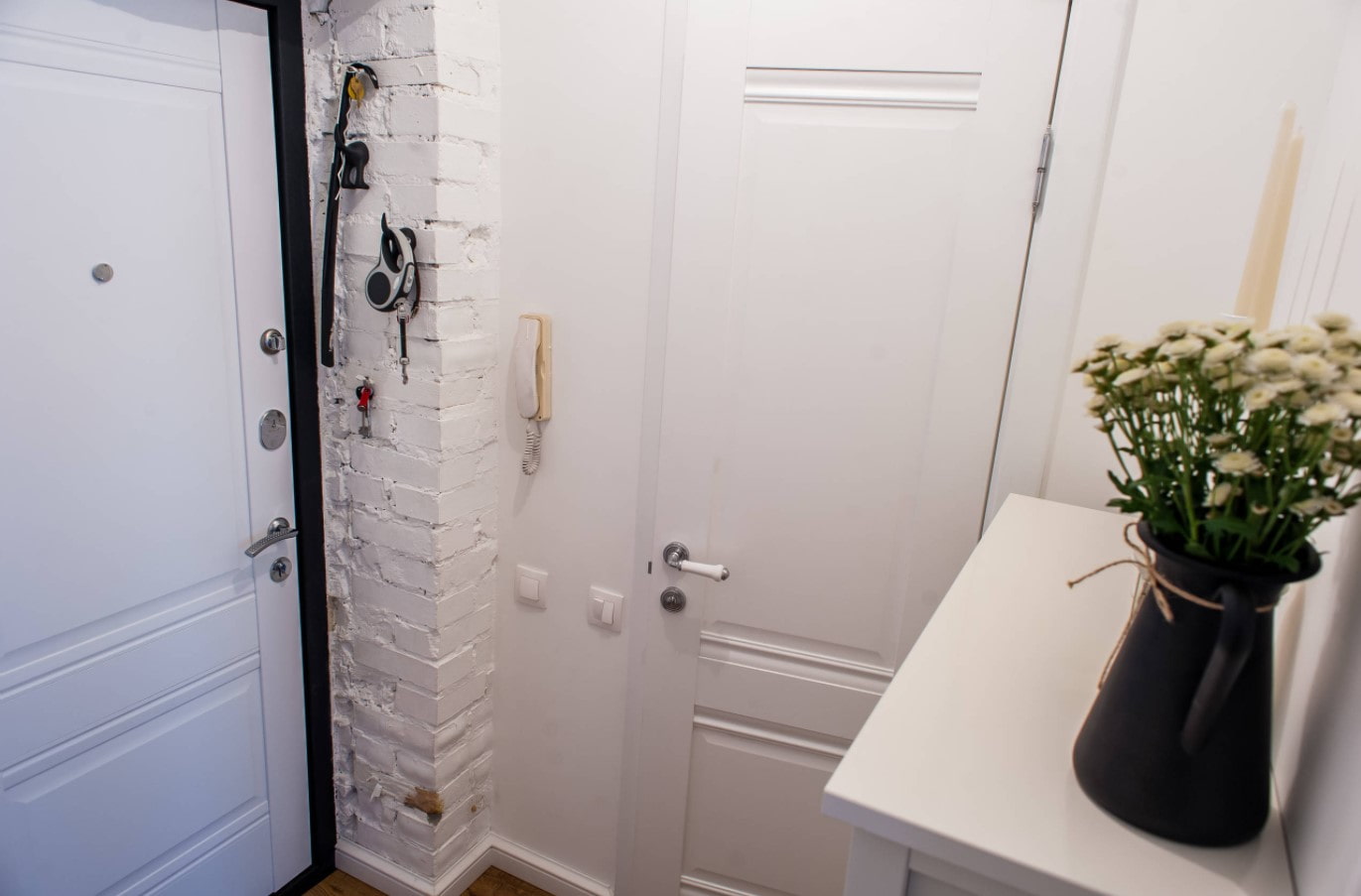 Ceramic tiles around the front door are used both independently and as a continuation of the wall decoration in the apartment.