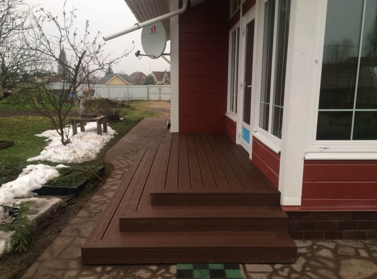 Advice! If it rains frequently in your area, cover your porch with a deck. The texture of the surface and the gaps between the boards will prevent water from accumulating at the entrance to the house or getting inside.