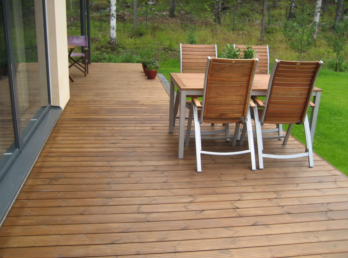 - Heat treated... Thanks to the steam sauna at a temperature of 200C, the parameters of the wood change for the better: the deck becomes more durable, not subject to drying out under direct rays.