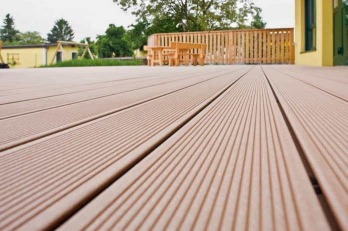 There is no need to prepare the deck board for installation - the logs are already painted and ready for use. Further care of the polymer floor is also minimal: it can withstand washing by any means, does not need to be processed.
