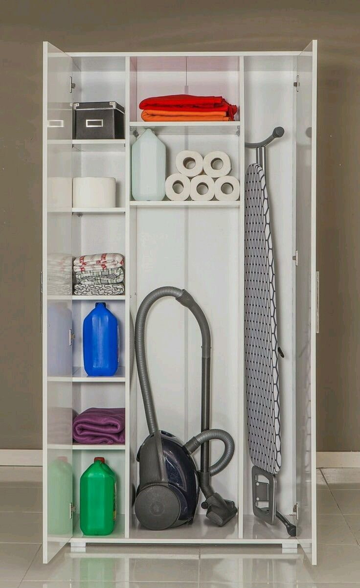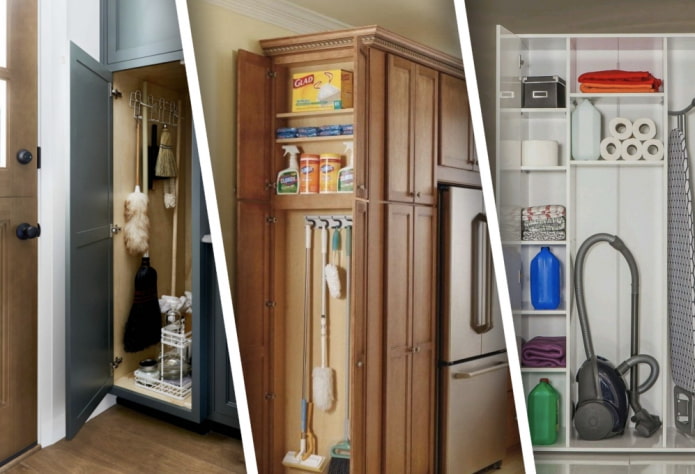 The most obvious and straightforward option is to store your vacuum cleaner, mops, and household chemicals in your closet. Even in small apartments there is a small space with a built-in pantry, in which you can distribute all the items and the story of the mop on the shelves. For a vacuum cleaner, since modern models have become more compact, it is better to allocate a separate shelf.