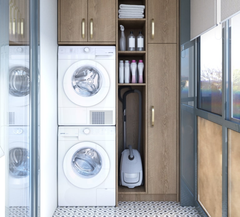 If you have a glazed balcony, why not use it as storage for cleaning equipment. This will make this traditional place for half-needed junk a little more useful.