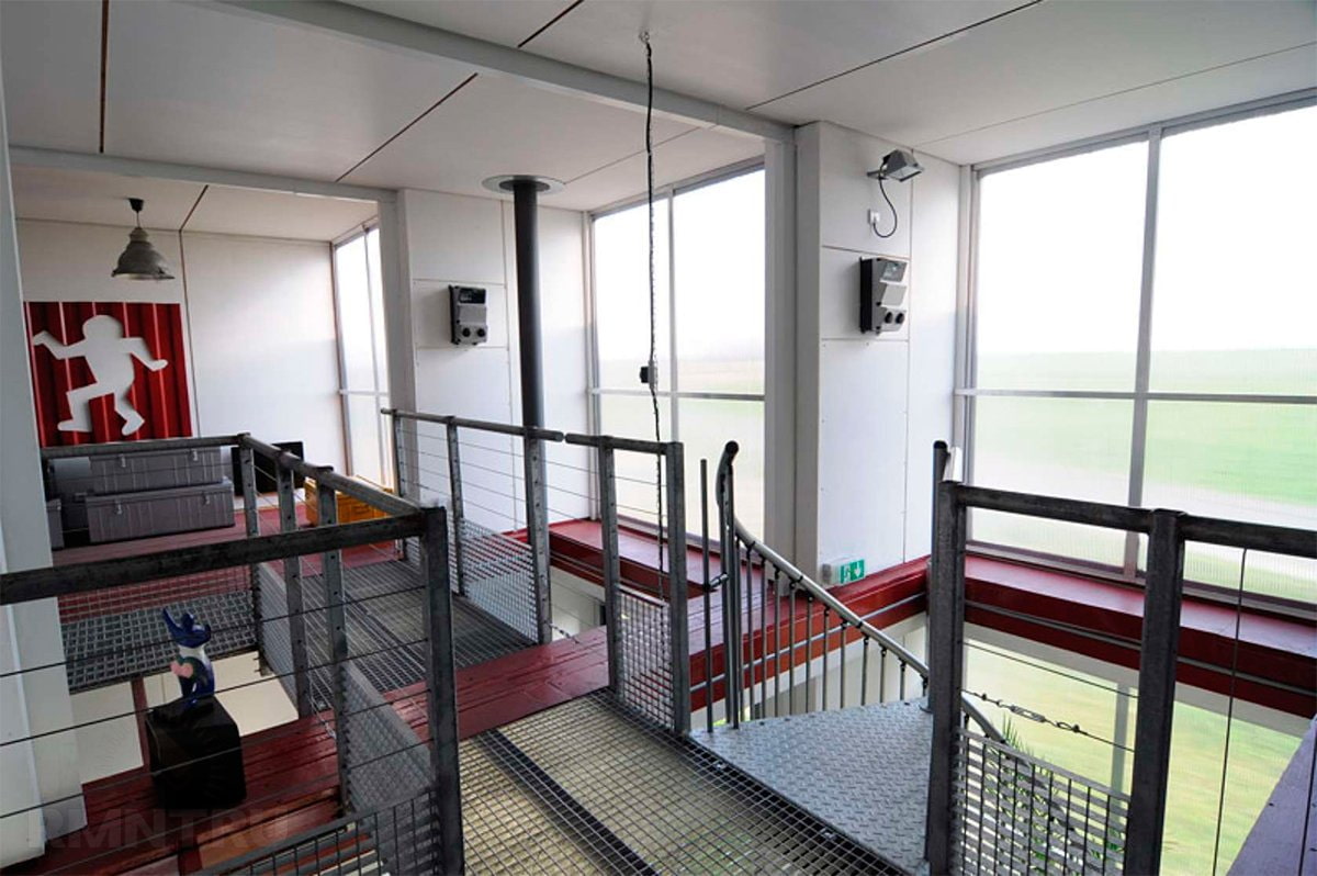 The photo shows a spiral staircase and bridges connecting two floors of containers.