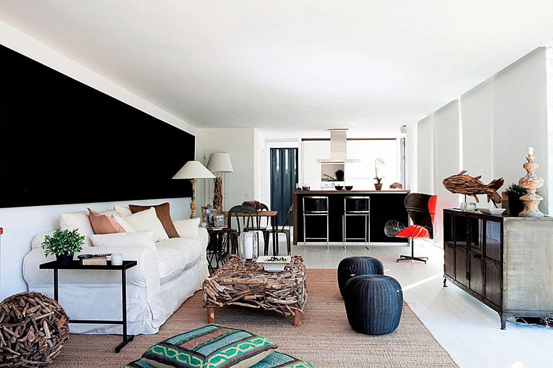 Pictured is a stylish living room with dining area and kitchen. The central room has high ceilings, so it seems more spacious than it really is.