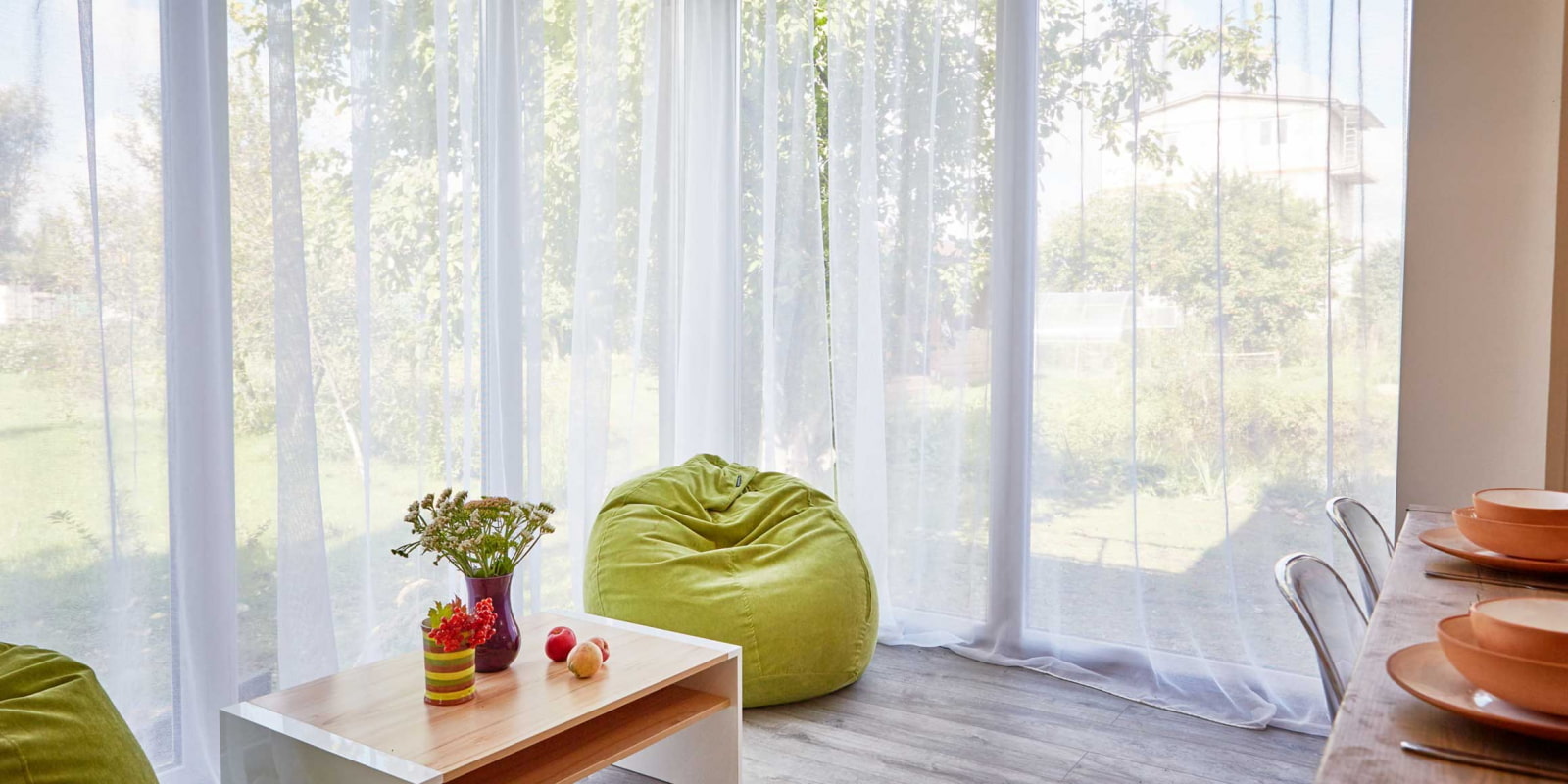 The photo shows an impressive youthful living room design that will cheer you up in any weather.