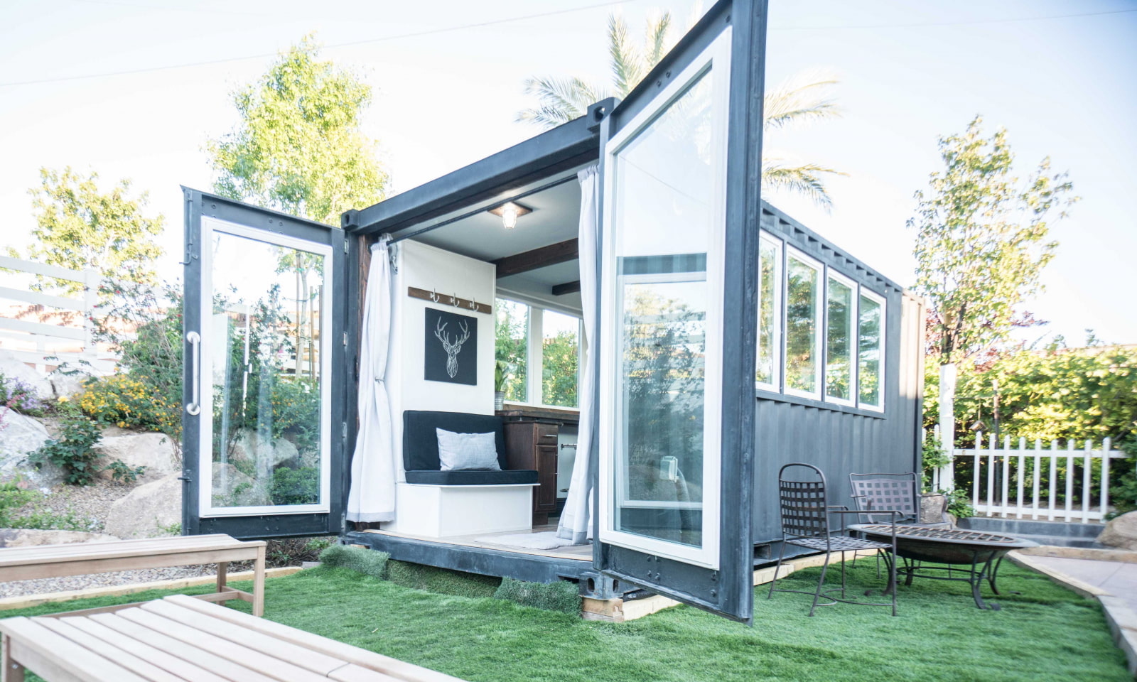 The photo shows the exterior of the house made of shipping containers and the patio, which creates a cozy shade.