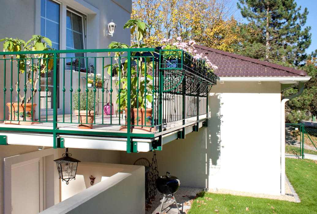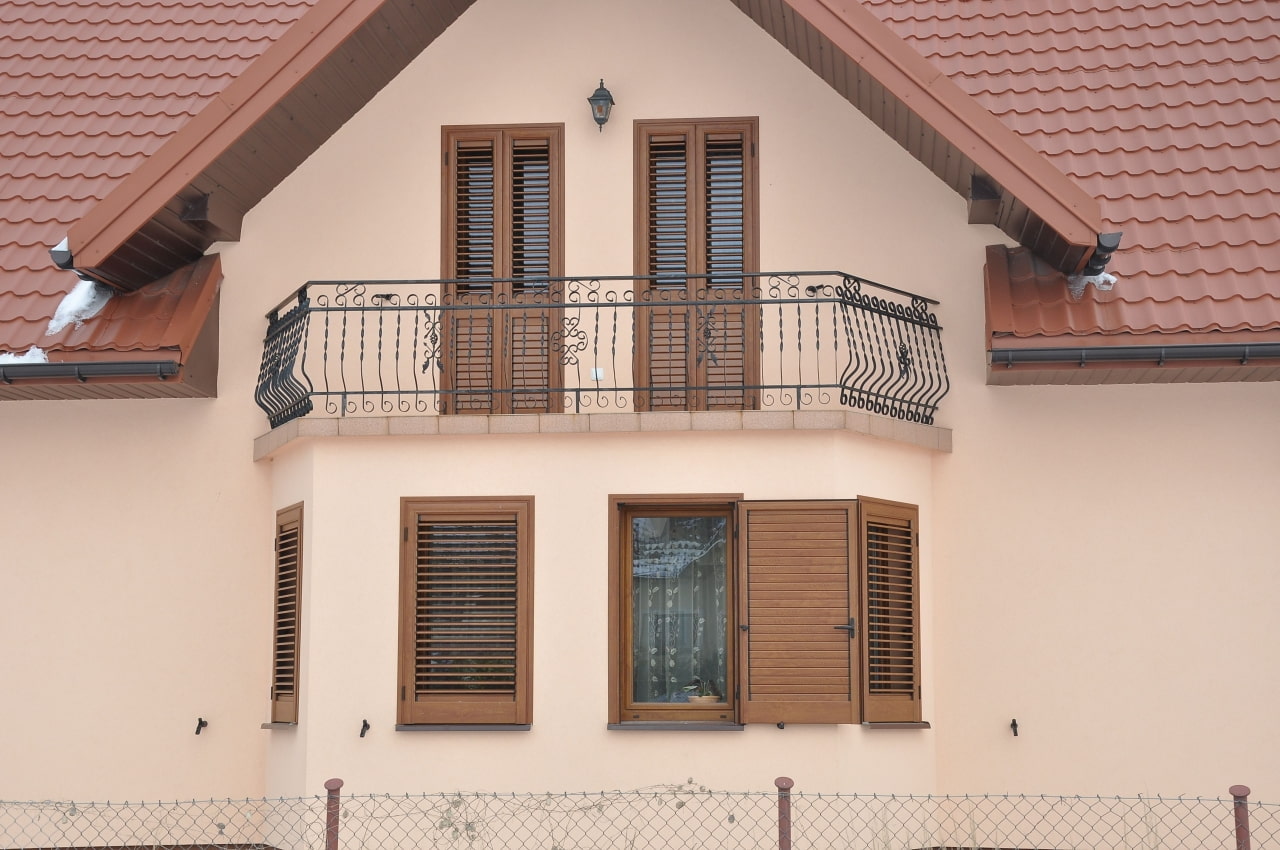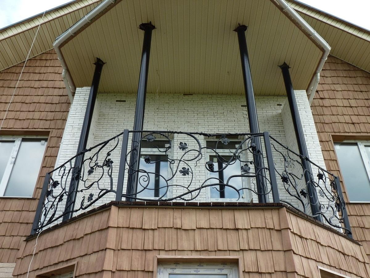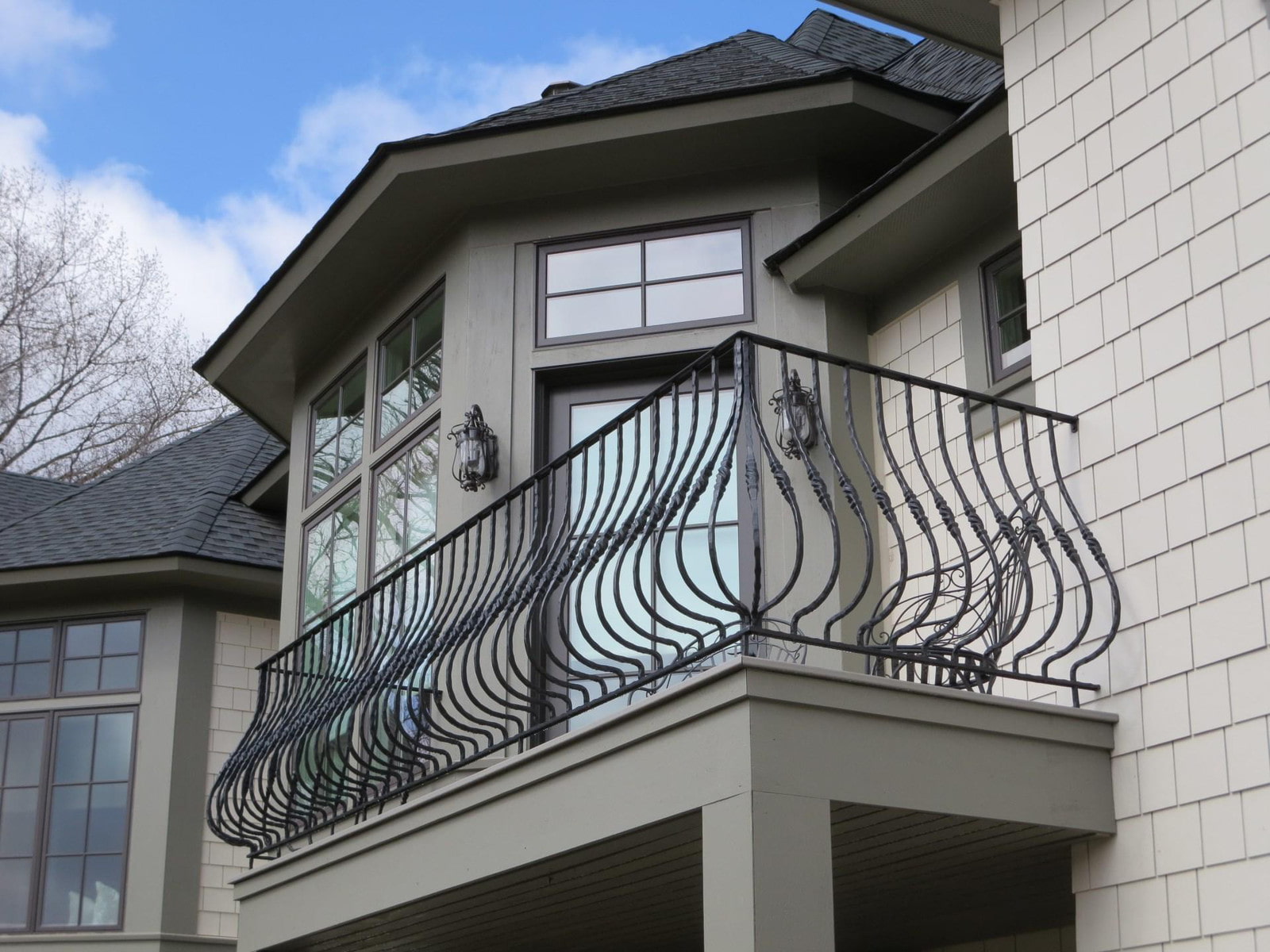 The photo shows a balcony structure with a forged metal fence in the exterior of the house.