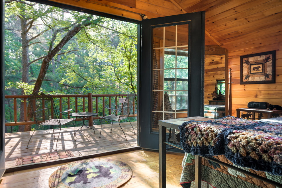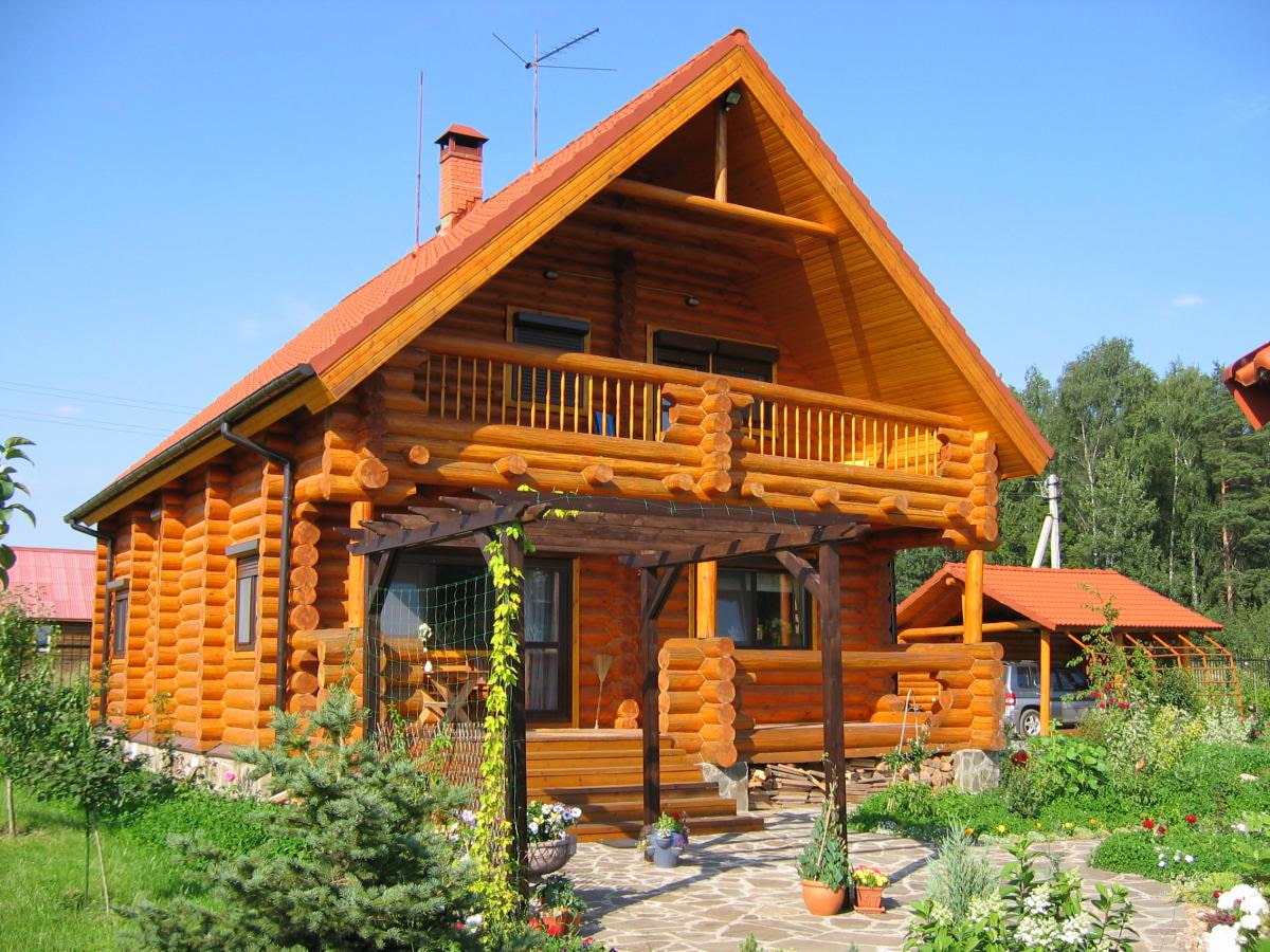 The photo shows the exterior of a wooden house from a bar with an open balcony.