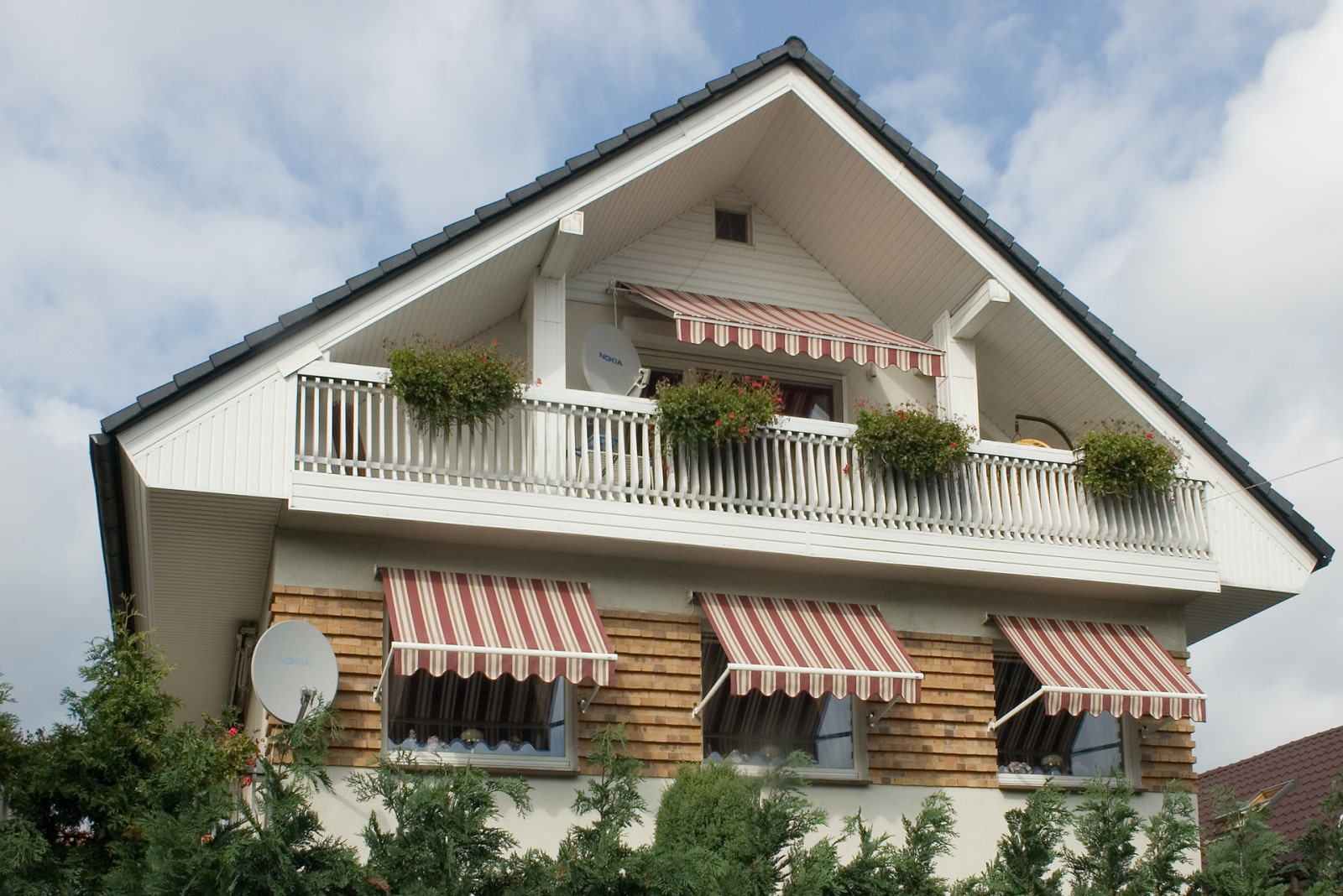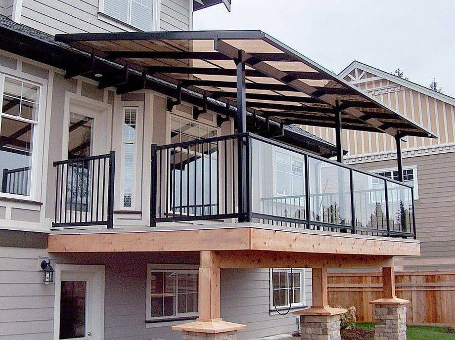 You can protect the open loggia from the sun due to the original awning canopy. Such a product will favorably decorate the facade of the house, as well as prevent the accumulation of snow and the formation of icicles.