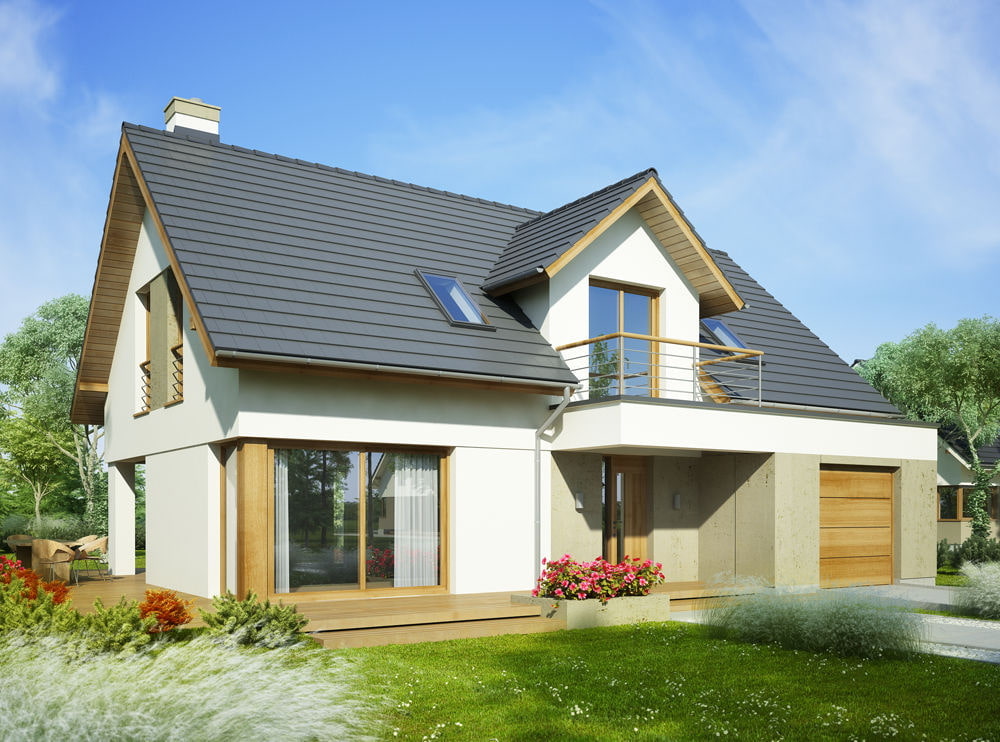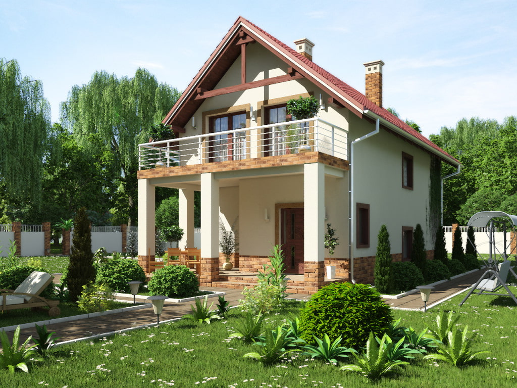 The widespread placement of the balcony is above the entrance to the house in the central part of the facade. This solution is perfect for a small cottage. The loggia, covered under a frontal canopy, will be a great resting place, which can be furnished with a small table, chairs or a sofa.