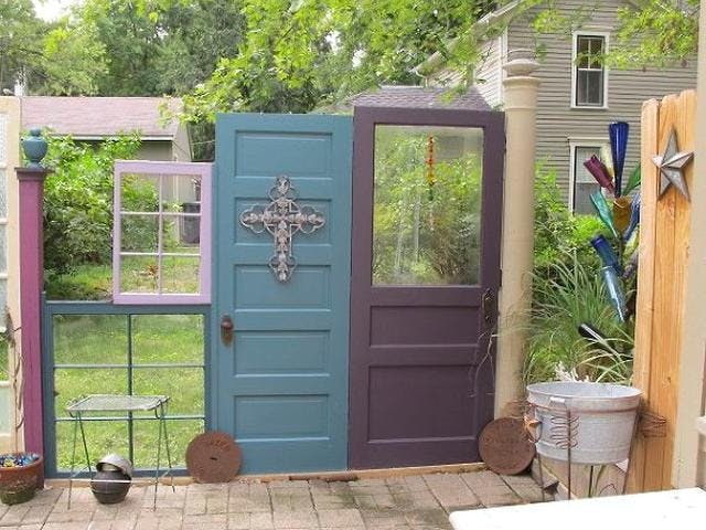 Such a unique fence will definitely not be overlooked. It is not necessary to use the same elements: a variegated collection of solid canvases or doors with glass inserts looks much more interesting than a similar fence. Traditional posts should be installed as supports.
