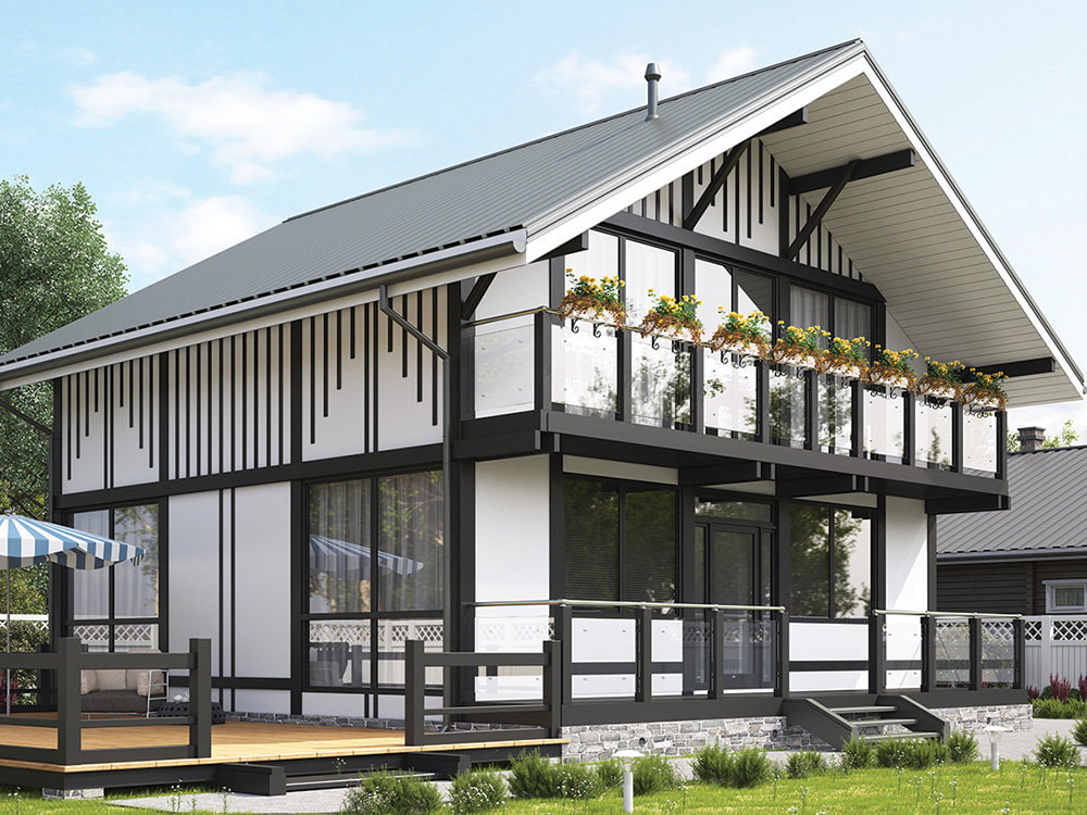 The asymmetrical shape, covering the entire residential structure, allows you to diversify the exterior of the house in the half-timbered style. Due to the long overhangs overlapping the side walls, the building looks very stylish and impressive.