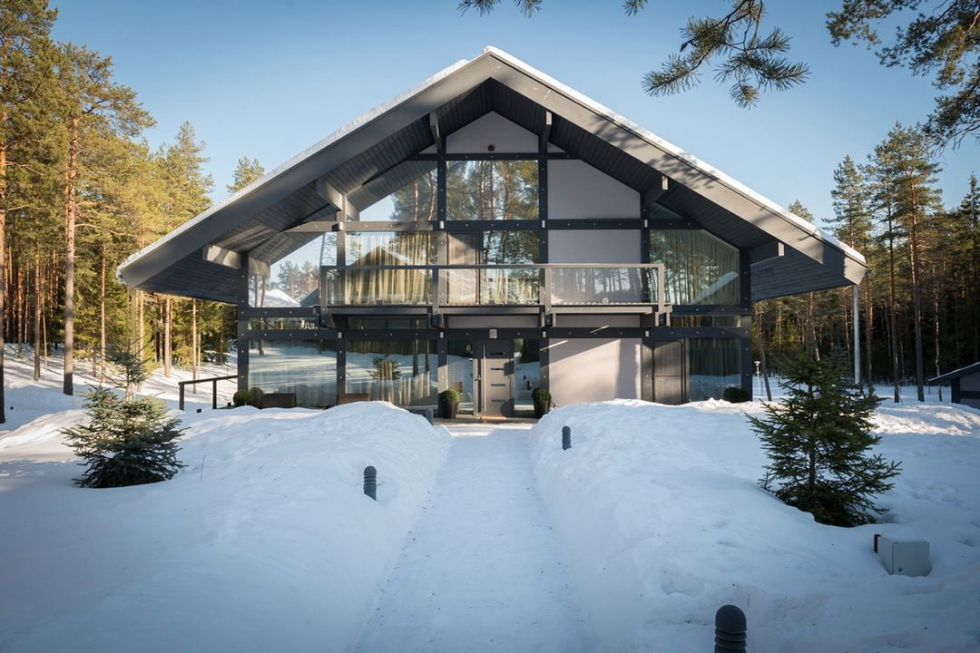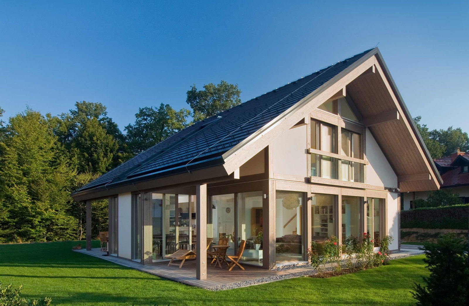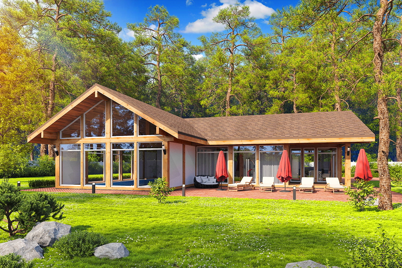 In the photo there is a project of a half-timbered house made of laminated veneer lumber with panoramic glazing.