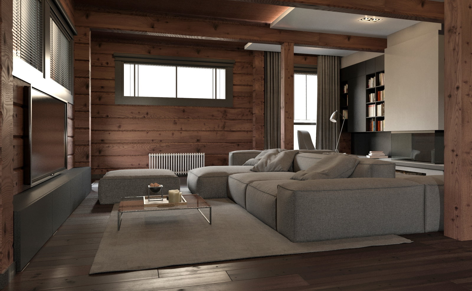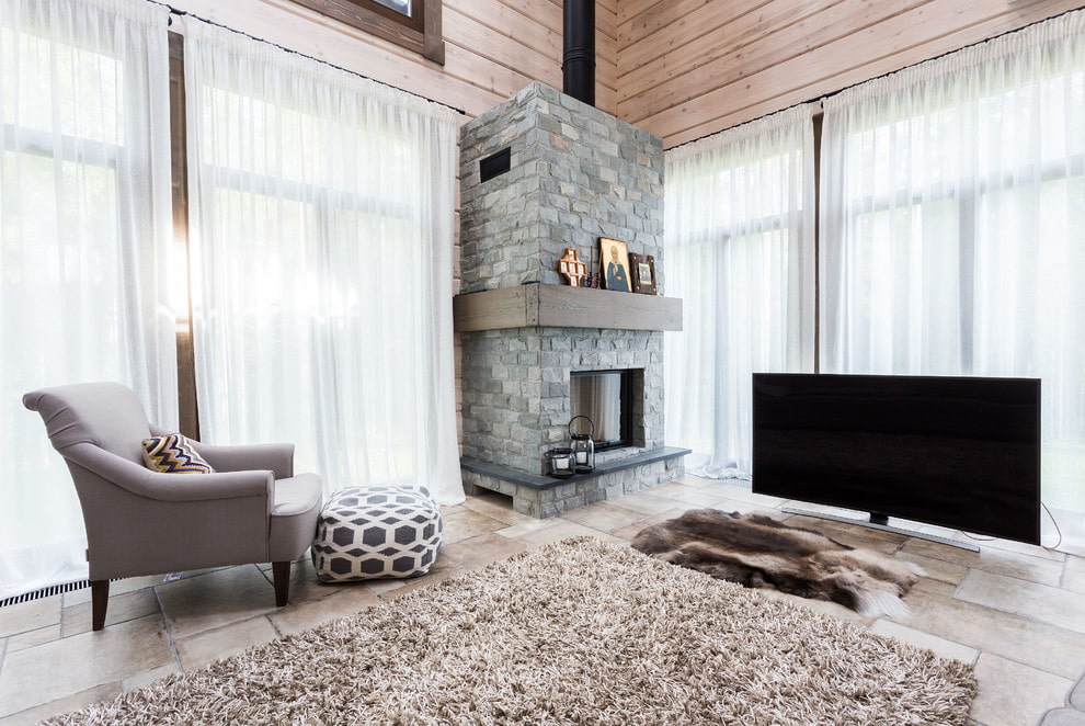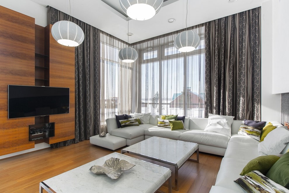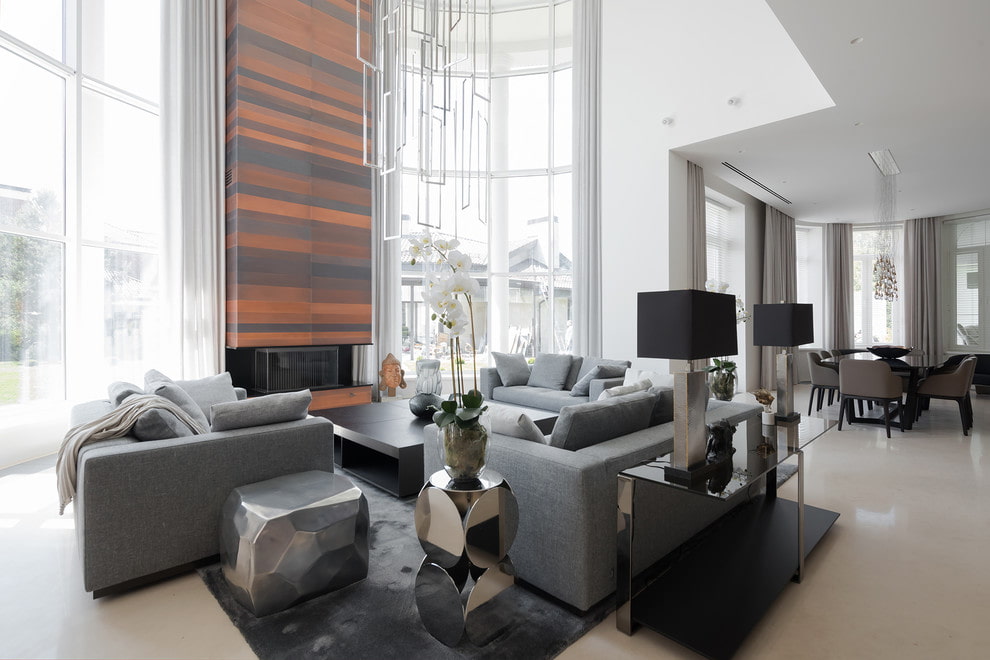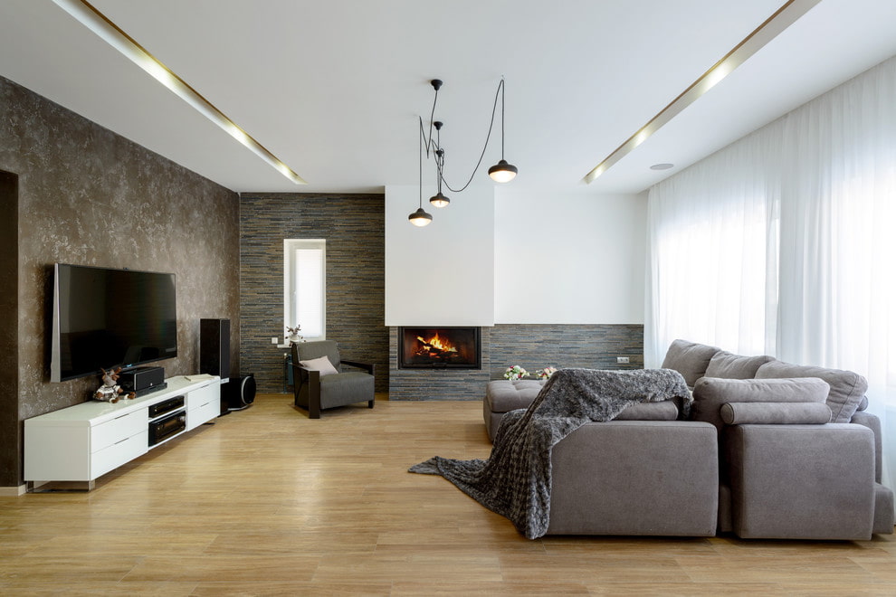 In the interior of a large living room, zoning can be performed and several separate areas can be distinguished. Functional segments are highly individual, depending on the specific preferences of the family. However, there are versatile areas in the form of a TV viewing area, a fireplace area and a fireplace, as well as a corner suitable for relaxing or reading.