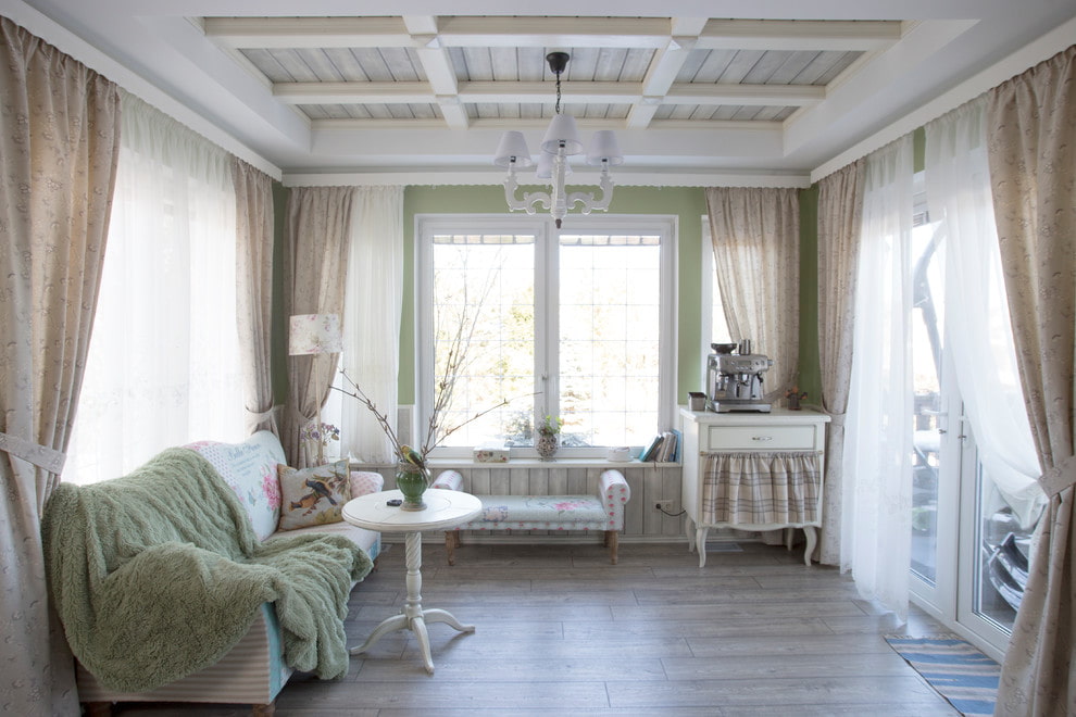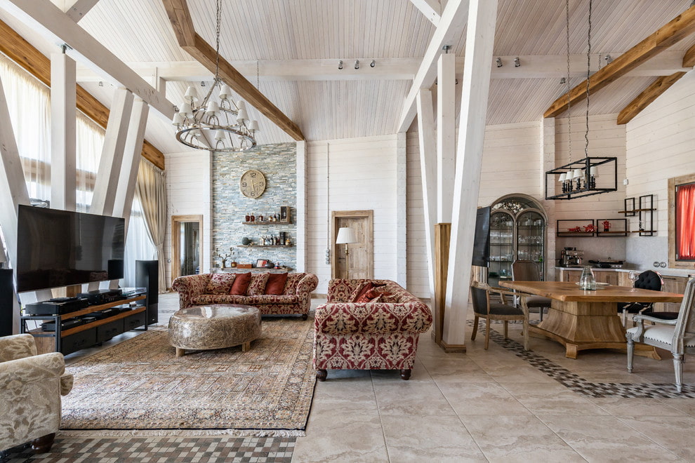 A harmonious addition to the country style will be decorative or real wooden beams, which in color and texture will overlap with other interior items made from natural materials.