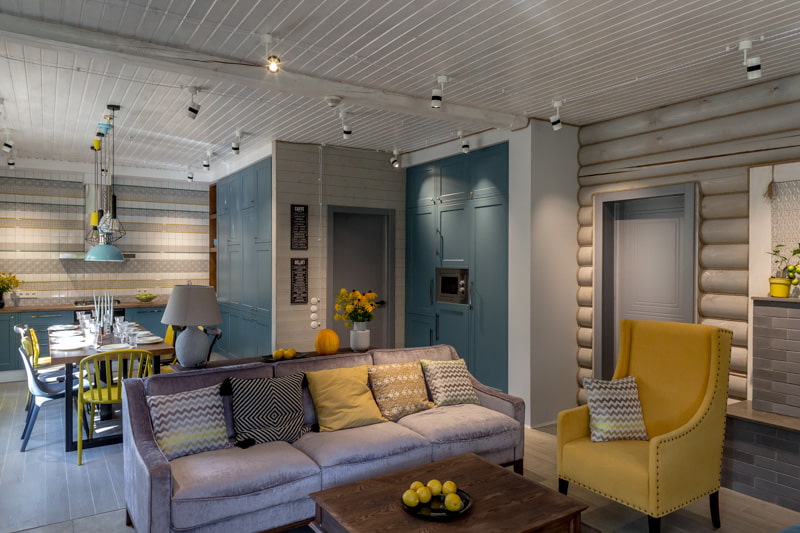 The most common is zoning, which does not require complex redevelopment and major repairs. Sections can be highlighted using contrasting colors, light, finishing materials, decorative walls, arches, mobile screens, furniture items, or different levels of the ceiling or floor. For example, in the interior of the hall combined with the kitchen, the working segment for cooking is located on the podium or separated by means of a bar counter, shelving unit, sofa, dining table or glass partition.