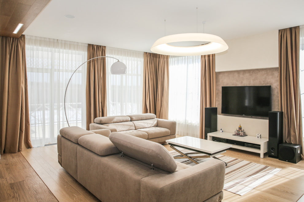 For a living room, a square-shaped room with the same length and width is best suited. A room of this configuration allows you to highlight functional areas using any partitions. For a hall in a private house, an area of 50 m2 would be ideal. You should think in advance how many window openings will be located in the room. To provide good natural light, the living room should have two or three windows.