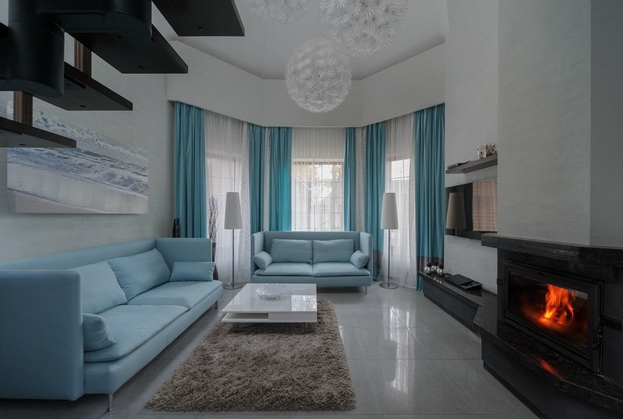 The main decoration of the living room design will be the fireplace portal. It is finished with stone, mosaic, brick, drywall, wood or plaster molding. The shelf above the hearth is decorated with all kinds of accessories and decorative elements.