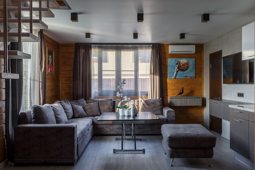 A regular or multifunctional folding table is installed next to the upholstered furniture set. The construction material should be combined with the style of the surrounding interior of the house.