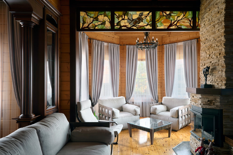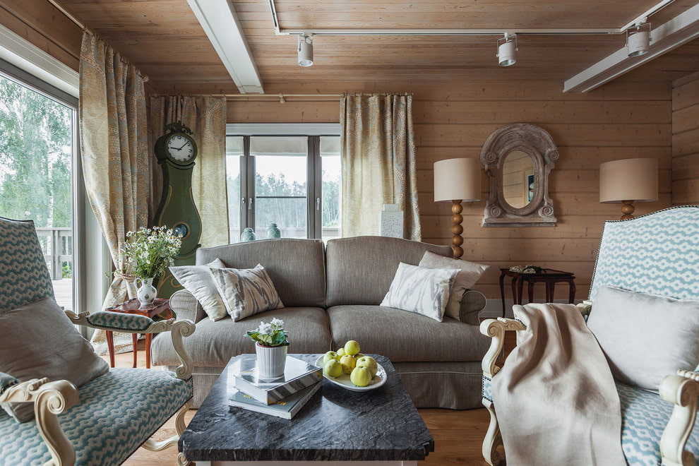 For the hall in the house, textile elements are selected from natural linen, cotton, silk, dusty velvet and denim materials. Floral ornaments are very common, which fit especially harmoniously into the interior of a wooden house.