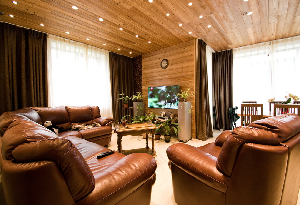 - Equally important is the competent organization of lighting that affects the atmosphere in the room. Large windows in a private home provide ample natural light. If the installation of panoramic window openings is impossible, you need to equip the room with additional lighting sources.