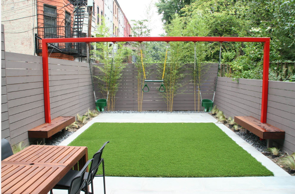 A bulky tree house won't fit here, but a small wigwam, sandpit and table will fit perfectly into the landscape. Also, the playground can be equipped with a swing: not only children, but also parents will be happy to spend time on them.