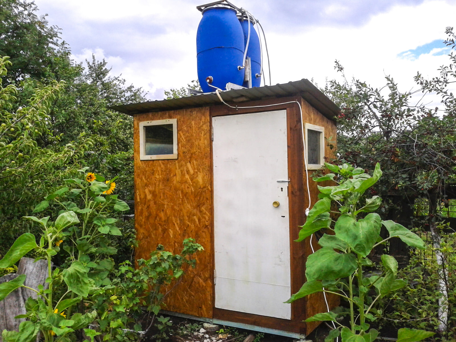 To convert a regular shower from a barn, you will need to install a tank or a plastic barrel on the roof, in which the water will be heated by the sun. A more difficult option that requires electrification is the purchase of a water heater and pump. It is also necessary to trim the inner walls with waterproof material and provide for a drain.