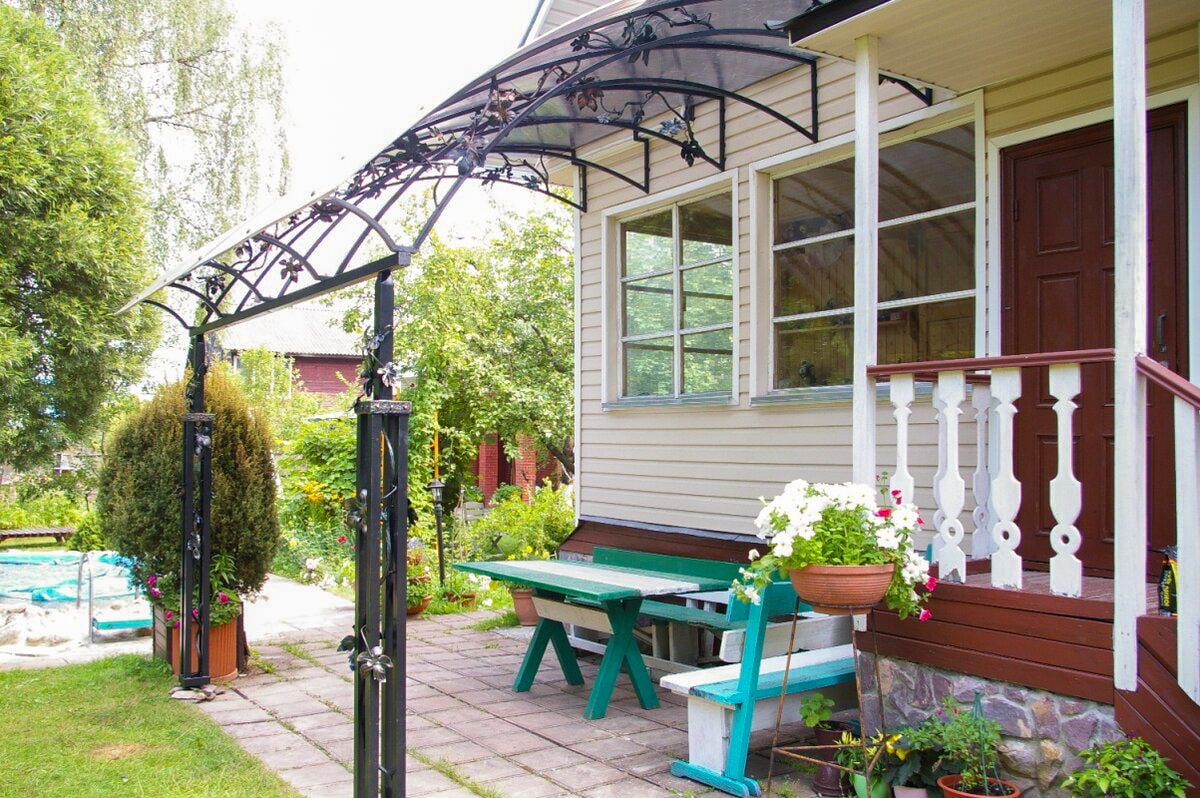 Such a building has a number of advantages - a flexible and durable roof is resistant to moisture, transmits light, but not ultraviolet rays, and is lightweight. Polycarbonate is easy to work with. Usually, the canopy is erected using a metal frame, creating a modern gazebo in the garden or equipping an extension with a seating area under the roof.