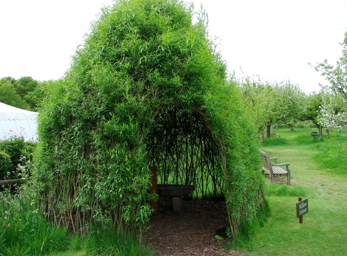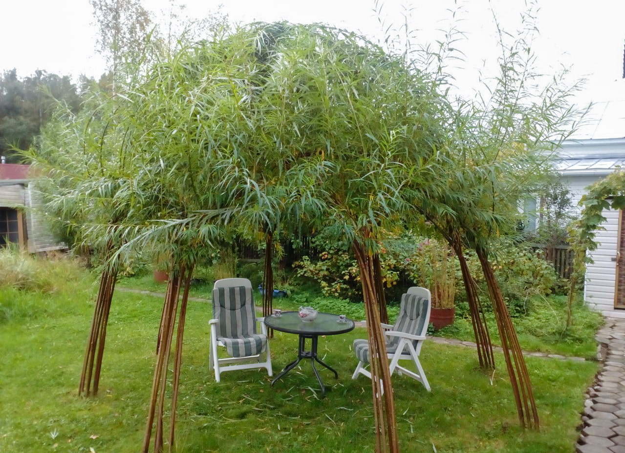 Fans of original ideas will appreciate the graceful willow arbor. The tree germinates very quickly, but it will take time to create a complete canopy. The willow should be planted in a circle, and the emerging shoots should be trimmed and guided. It will take 2-3 years to form a full-fledged gazebo.