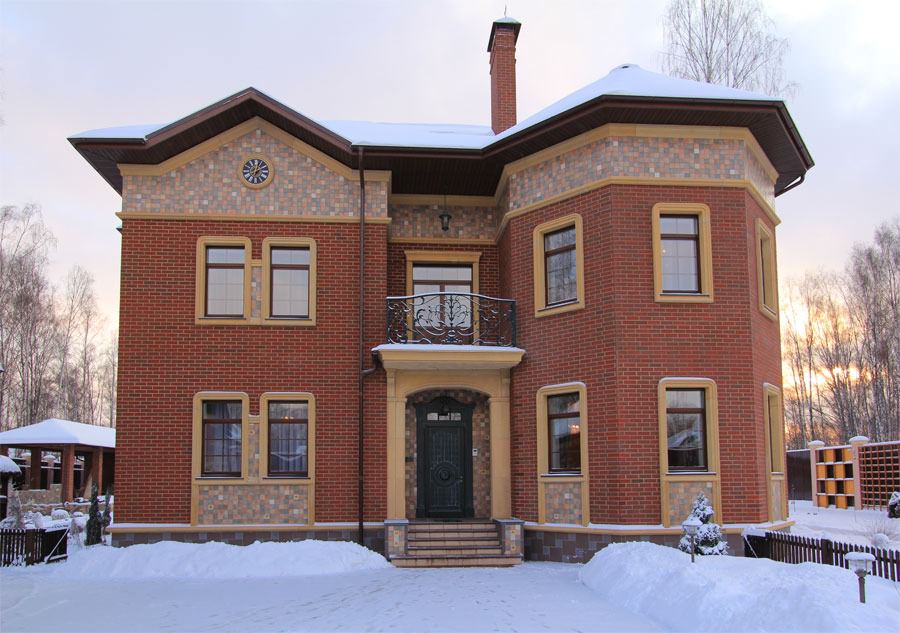 Beautiful brick facades in the traditional style are obtained from bricks of red and brown shades. Houses decorated in this way are reminiscent of the estates of past centuries and give rise to a feeling of peace and comfort.