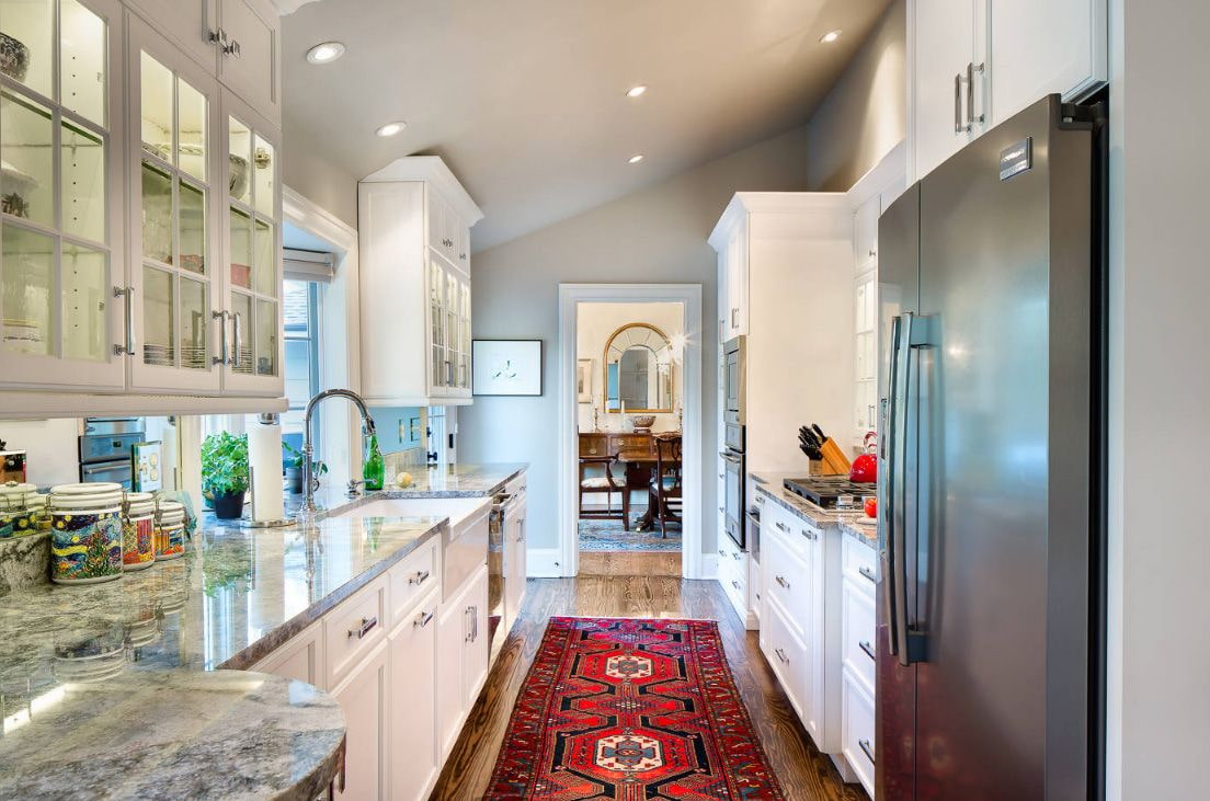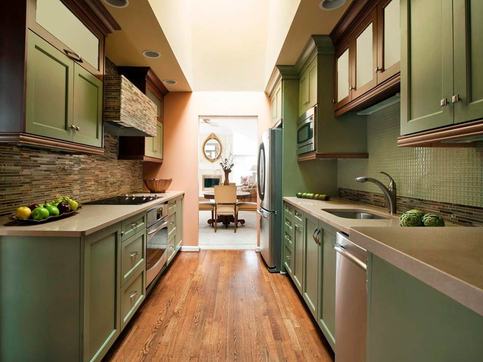 - Parallel layout. A two-row kitchen involves arranging cabinets along opposite walls with a wide aisle between them. One row may be shorter than the other, in which case the vacant space is usually used to accommodate a dining group. This arrangement is suitable for a narrow elongated or walk-through room.