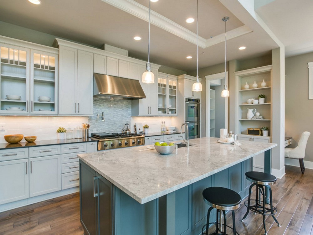 The photo shows an example of an island layout. This design of a large kitchen is optimal for a private house. The island serves as a dining table, work surface and kitchen cabinet at the same time.