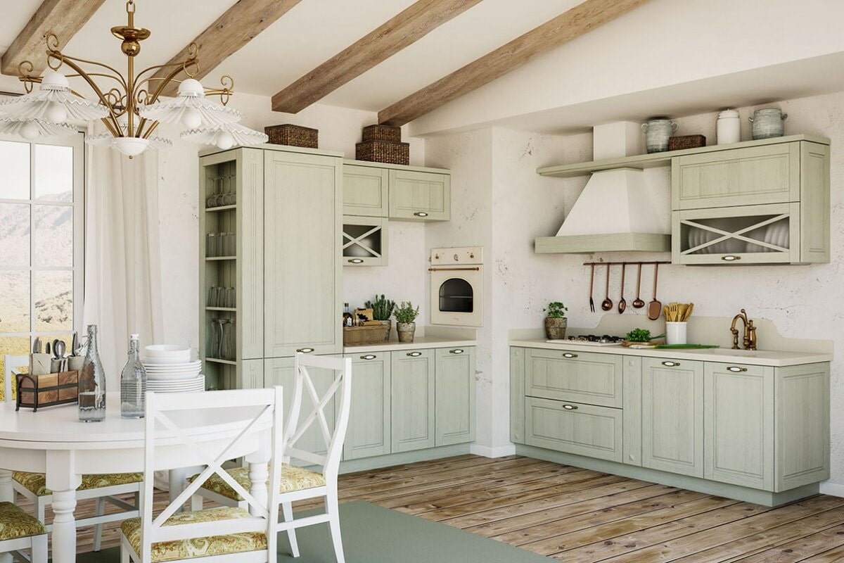 Shown here is a classic-style kitchen. Pastel colors, flowing lines, restrained decor create an atmosphere of comfort and luxury.
