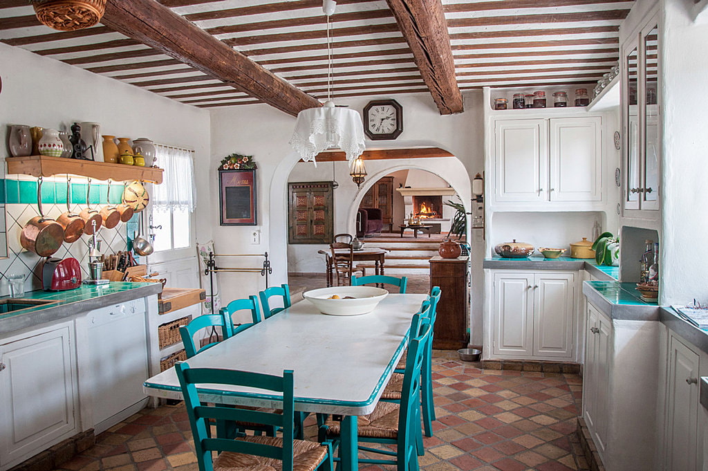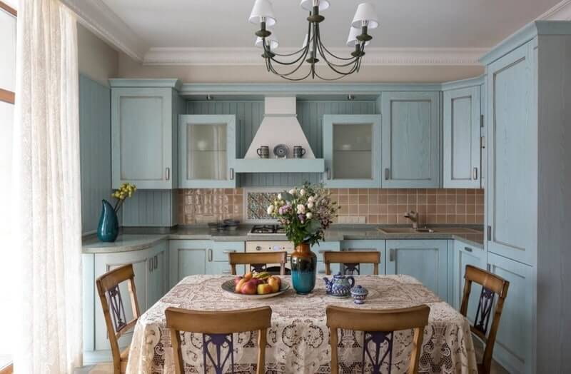 - Provence and country. One of the best solutions for decorating a kitchen in a country house. Light shades, wooden furniture, embroidered textiles, porcelain décor are associated with a house in a village filled with warmth and comfort. Flowers can be everywhere - in a vase on the table, in pots on the windows, as a pattern on curtains or a pattern on tableware. Such an interior echoes the atmosphere of the countryside and emphasizes the closeness to nature.
