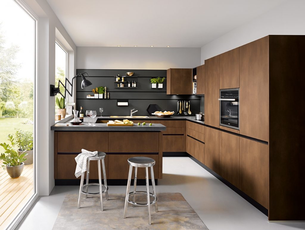 - Corner layout. L-shaped arrangement is suitable for any area. This scheme is ideal for a square kitchen, it goes well with a bar counter, kitchen island or peninsula.