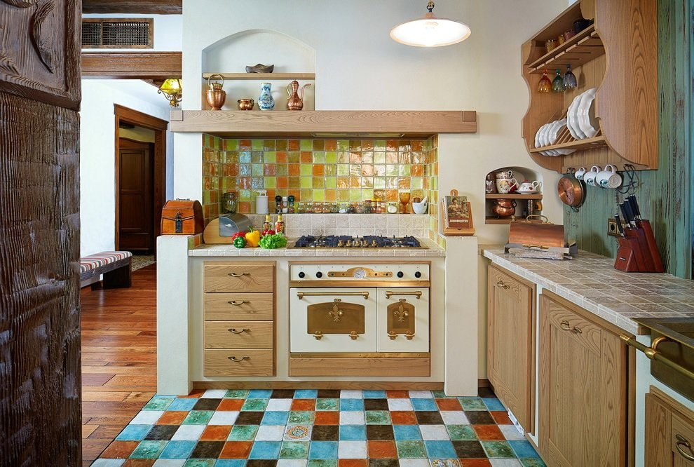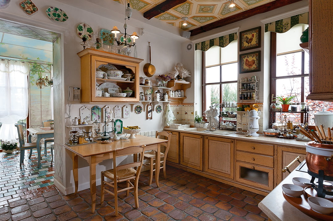 The decor of the kitchen in a private house plays an important role, as shown in the photo. Shelves with containers for spices, decorative plates, floral ornaments on textiles and dishes, an abundance of cooking tools in combination with wooden furniture emphasize the rustic chic of the country-style interior.