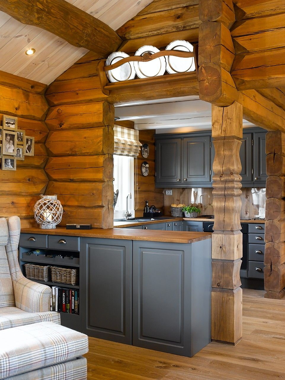 The kitchen in a log house should be bright for comfortable cooking. However, dark wood chopped walls (if you left them in their natural shade) obscure the light, so there should be more of it than usual.