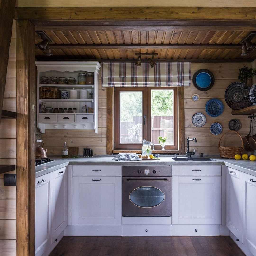 Ceiling. Depending on the chosen style of kitchen in a wooden house, there are two options: leave the ceiling in the wood, add beams. Or order a tensioner - all imperfections and necessary communications (electrical wiring, pipes) will be hidden behind it. If the kitchen in a wooden house is small, order a glossy canvas. Large - matte or satin.