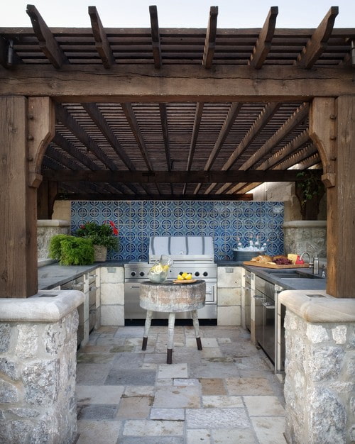 The design of such a summer kitchen includes a covered and free area.The closed area houses the cooking area with appliances, countertops and cabinets. And the dining table and seating area are in the fresh air. It is more difficult to design a combined structure, but it will cost less than a one-piece enclosed space.