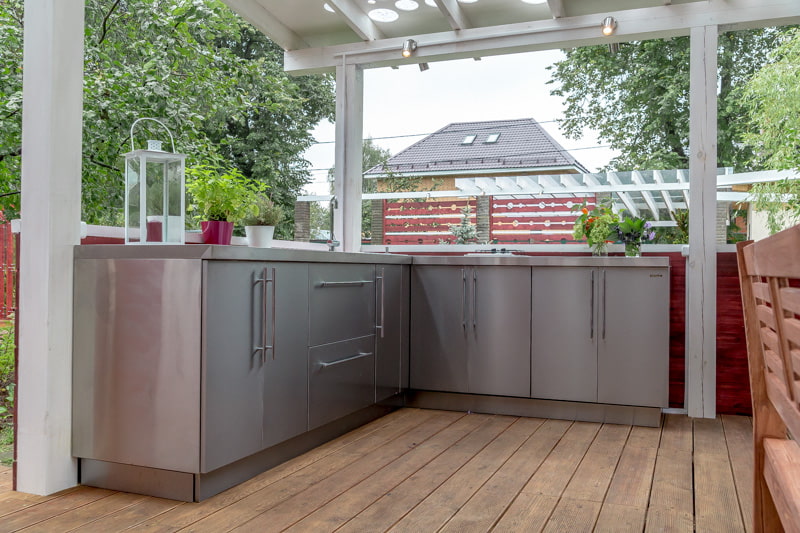 Open kitchens are called gazebos, patios or terraces without walls (all or part), sometimes without a roof. Open summer kitchens are not insulated, so it will be comfortable to spend time here only on a fine summer day. The obvious design benefits include cost and time savings during construction. Disadvantages - the inability to protect furniture and equipment from natural disasters, animals and insects. For the same reason, all equipment will have to be brought into a warm room for the winter.
