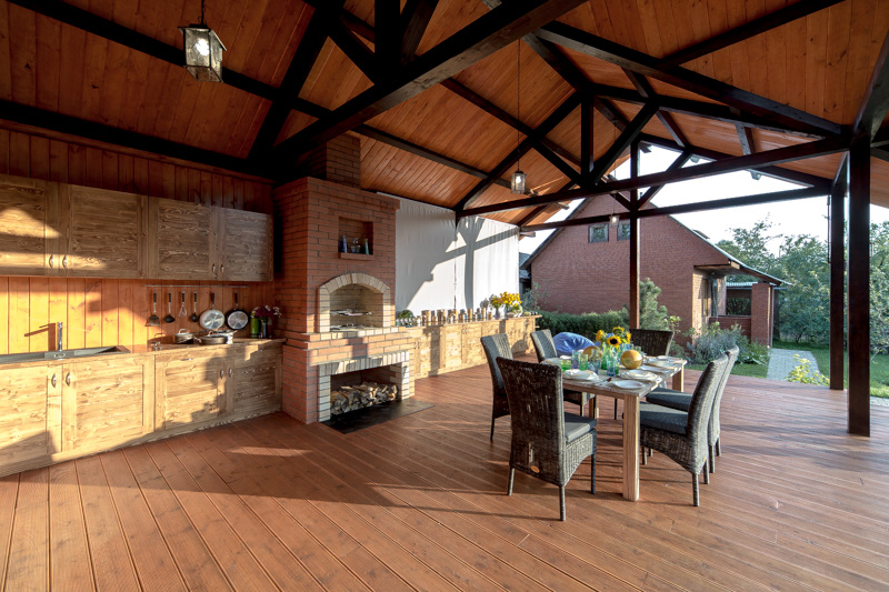 - use two wood colors - dark natural and light colored to add dynamics to the interior of your summer kitchen;