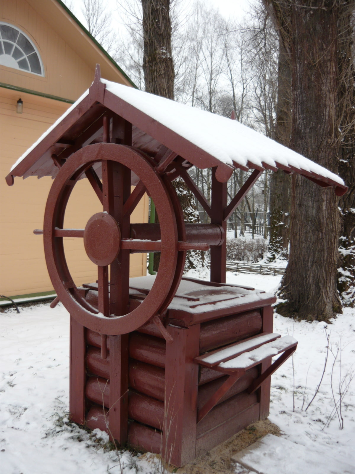 The only nuance that needs to be considered is absolute lack of natural protection against water... Constant contact with water destroys the structure of the tree, promotes rotting. But if you take dense beams of larch or aspen instead of flat boards, additionally treating them with special compounds, the frame over the water source will stand for many years.