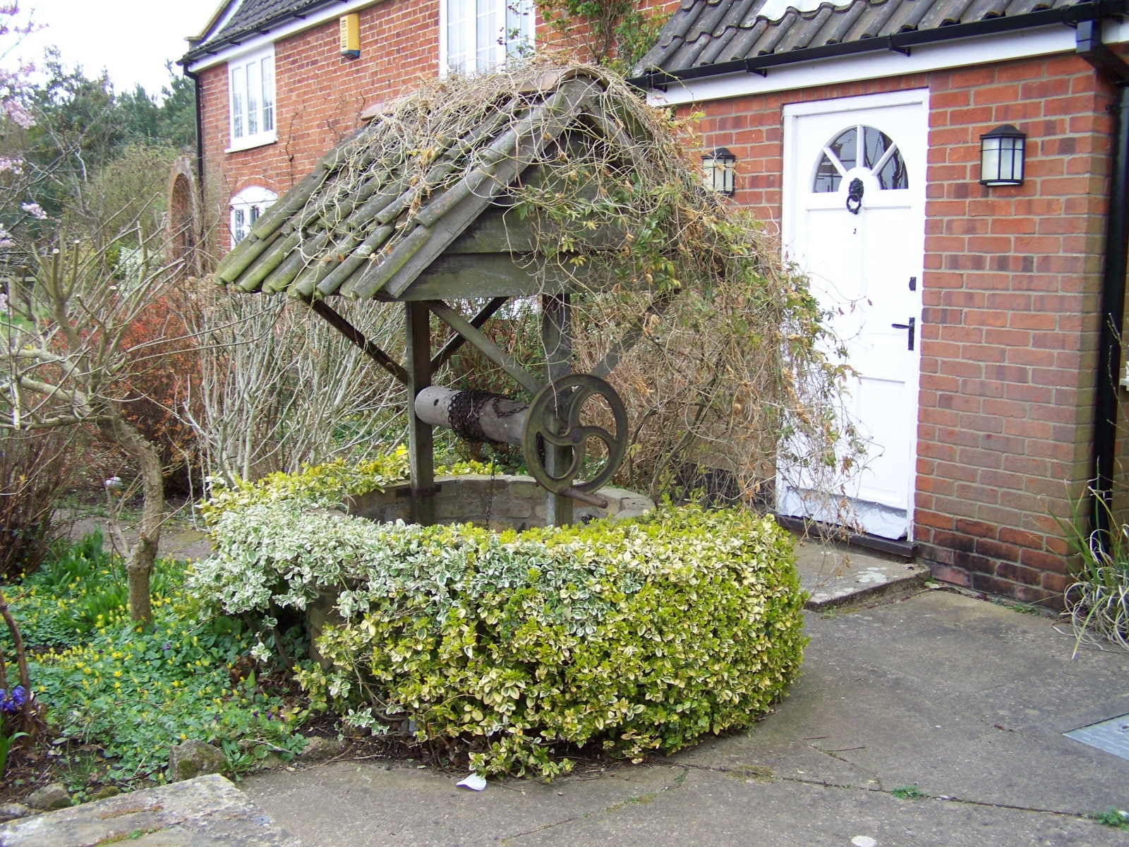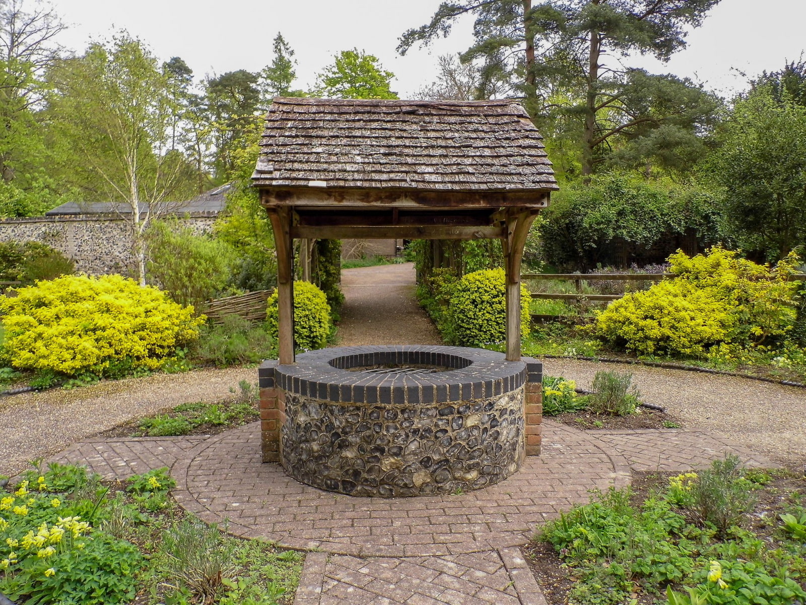 In the photo there is a round brick well