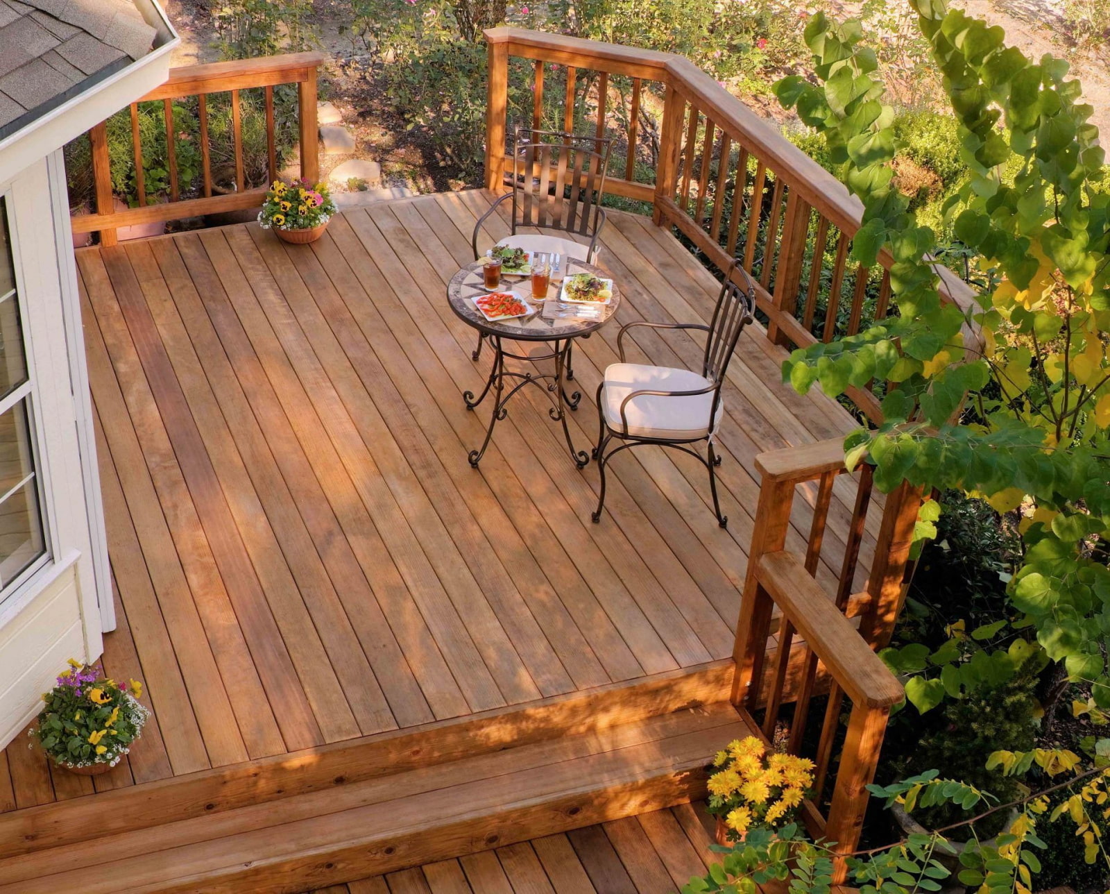 - Wooden patio - the most environmentally friendly, budget option, but at the same time the most short-lived. The tree rots from constant contact with water, is afraid of insects, is flammable - it must be treated with protective compounds, which complicates and increases the cost of the process.